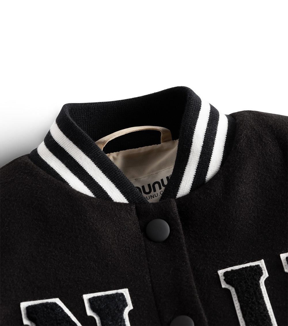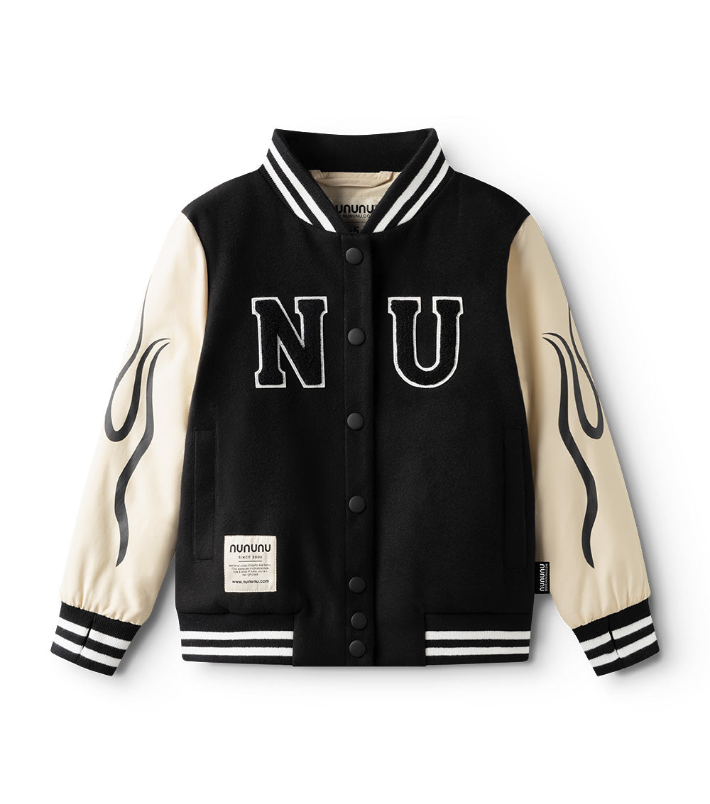 school spirit, just got a major upgrade with this letterman-style jacket. a classic look goes full rebel with a black felt vest & natural-colored faux leather sleeves printed with tattoo-style black flames. black & white details keep it bold with fuzzy patches of n & u on each side of the chest & striped ribbing at the collar, cuffs, and hem. a full set of snap buttons are there to wrap it all up. but the back is where the real story is at. our lightly-stitched graphic features a fearless feline breaking free with nothing but love & a really loud roar, kinda like your kid when rooting for their home team.