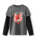 woah, did you hear that? this single cotton twofer is roaring big time with a bold red print of a tiger. but don’t let that sweet little star and matching smile fool you. this kitty is fierce but in a cute way. just like your kid. and to match that feistiness, this dark grey shirt hangs over long black sleeves with custom deconstruction. oh yeah and behind the furry head, it says control freak in angular letters that look kinda like they were spelled out with sticks. with a look this in sync with your kid’s psyche, this shirt is ready to pounce on the number one spot for their all time fave look.