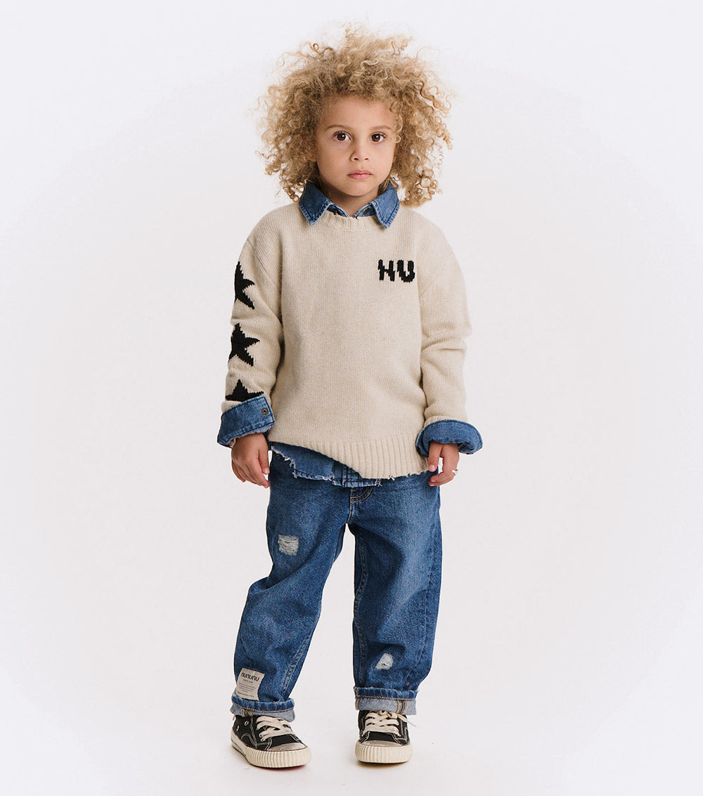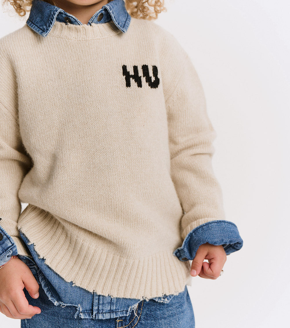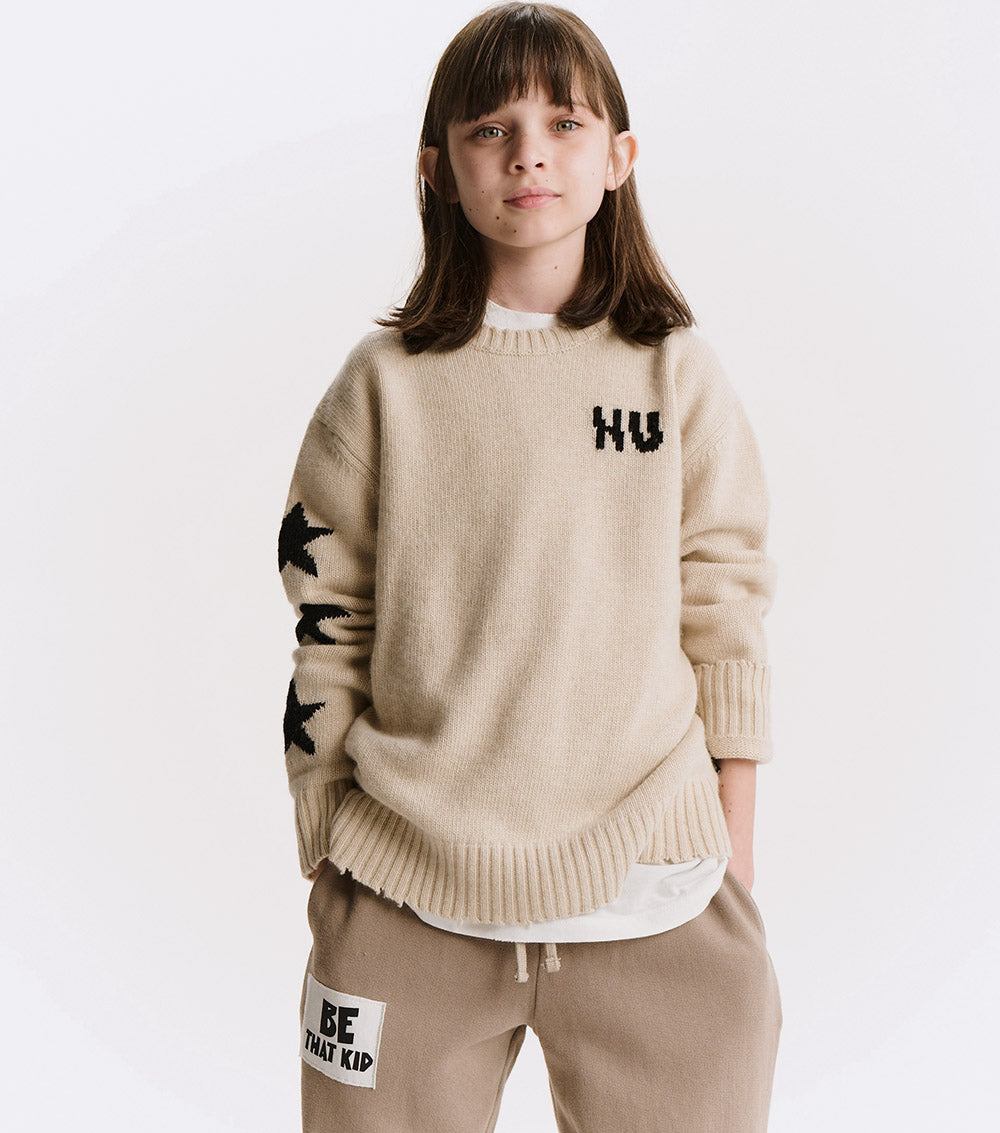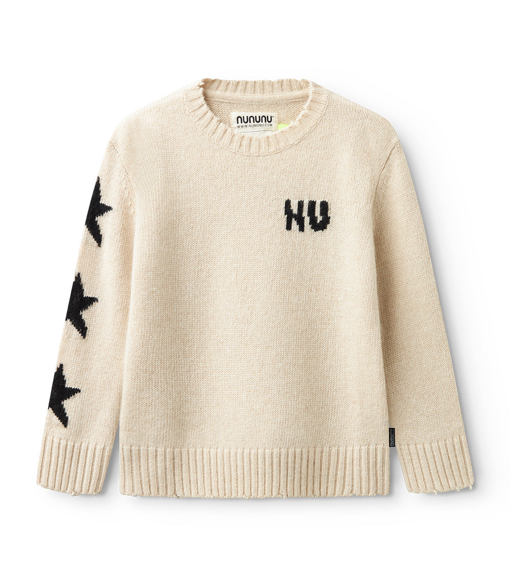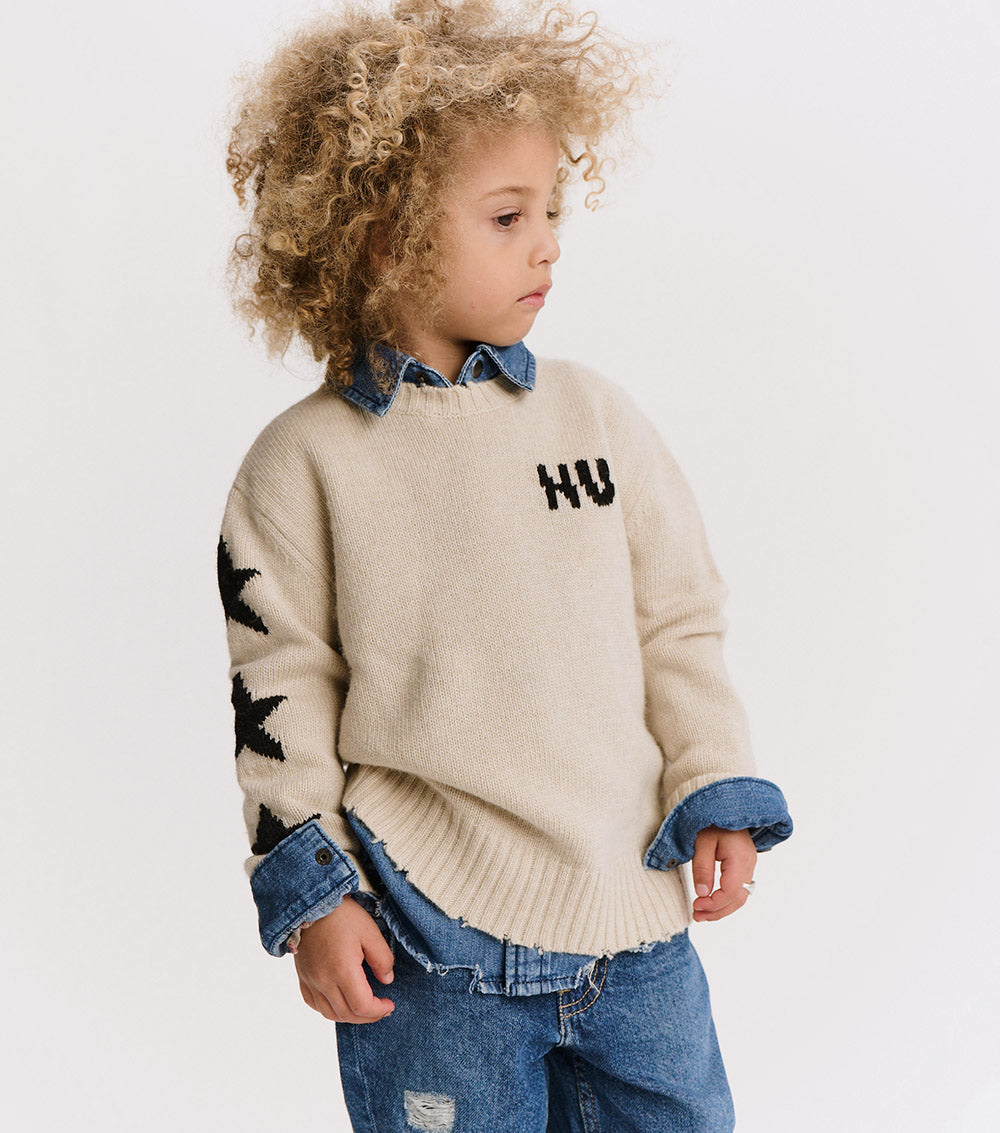 can’t decide between the grunge or polished look? have both with this natural cashmere blend crew neck. it’s a classic fit with nu knitted in white with a little glitch to make it look like the letters have been sliced in half. to give it some rebel vibes, we’ve got three white stars on one sleeve & custom deconstruction along the edges. layer over a collared shirt to lean into the og preppy look or pair with chunky black boots to go more punk with it. either way, this one is sure to be the star of the show