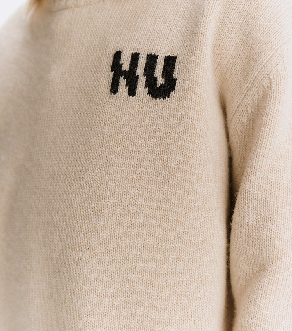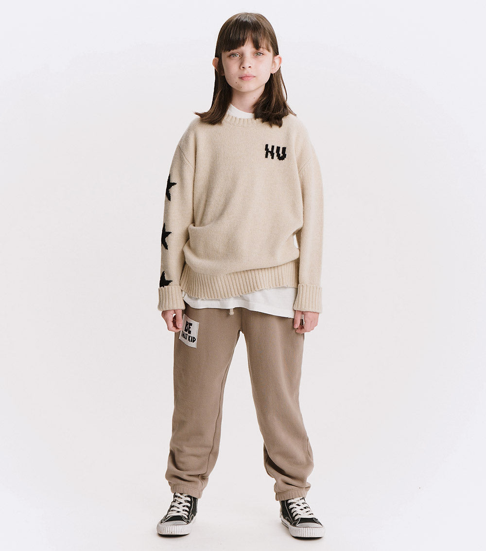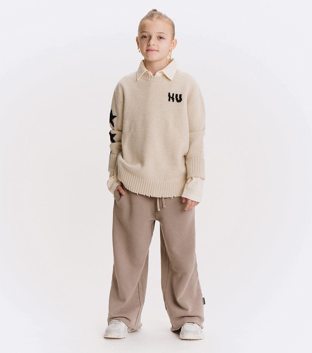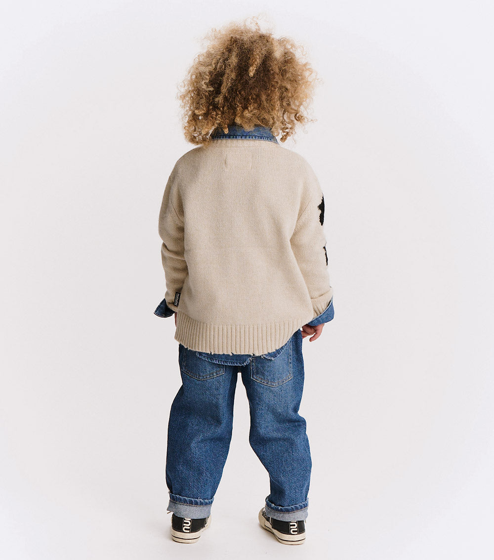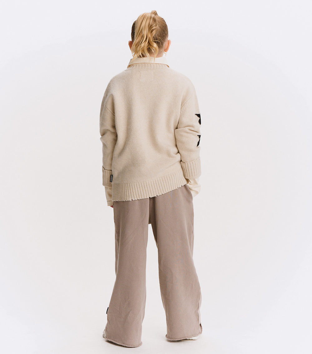 can’t decide between the grunge or polished look? have both with this natural cashmere blend crew neck. it’s a classic fit with nu knitted in white with a little glitch to make it look like the letters have been sliced in half. to give it some rebel vibes, we’ve got three white stars on one sleeve & custom deconstruction along the edges. layer over a collared shirt to lean into the og preppy look or pair with chunky black boots to go more punk with it. either way, this one is sure to be the star of the show