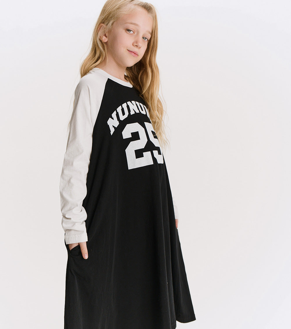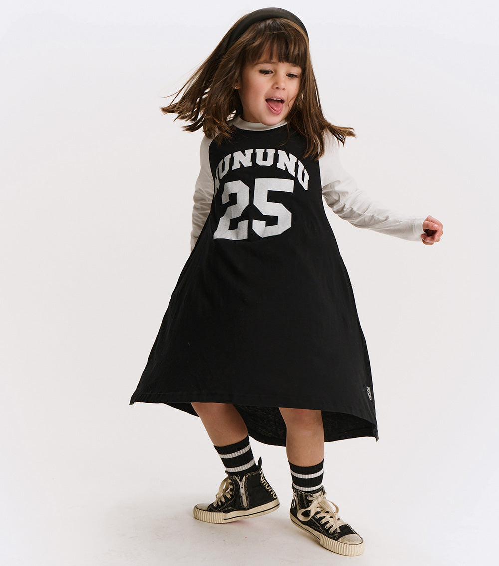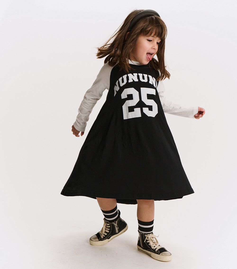 a baseball tee stolen from big bro, but make it a dress. this single cotton fan favorite is a raglan-style long sleeved fit in black with bold white details ready to swing, spin & own the room. our logo print arches up top in sporty white letters, while 25 screams out the number of the kid on this team. it’s oversized, unbothered, and completely owned by this little sibling now.