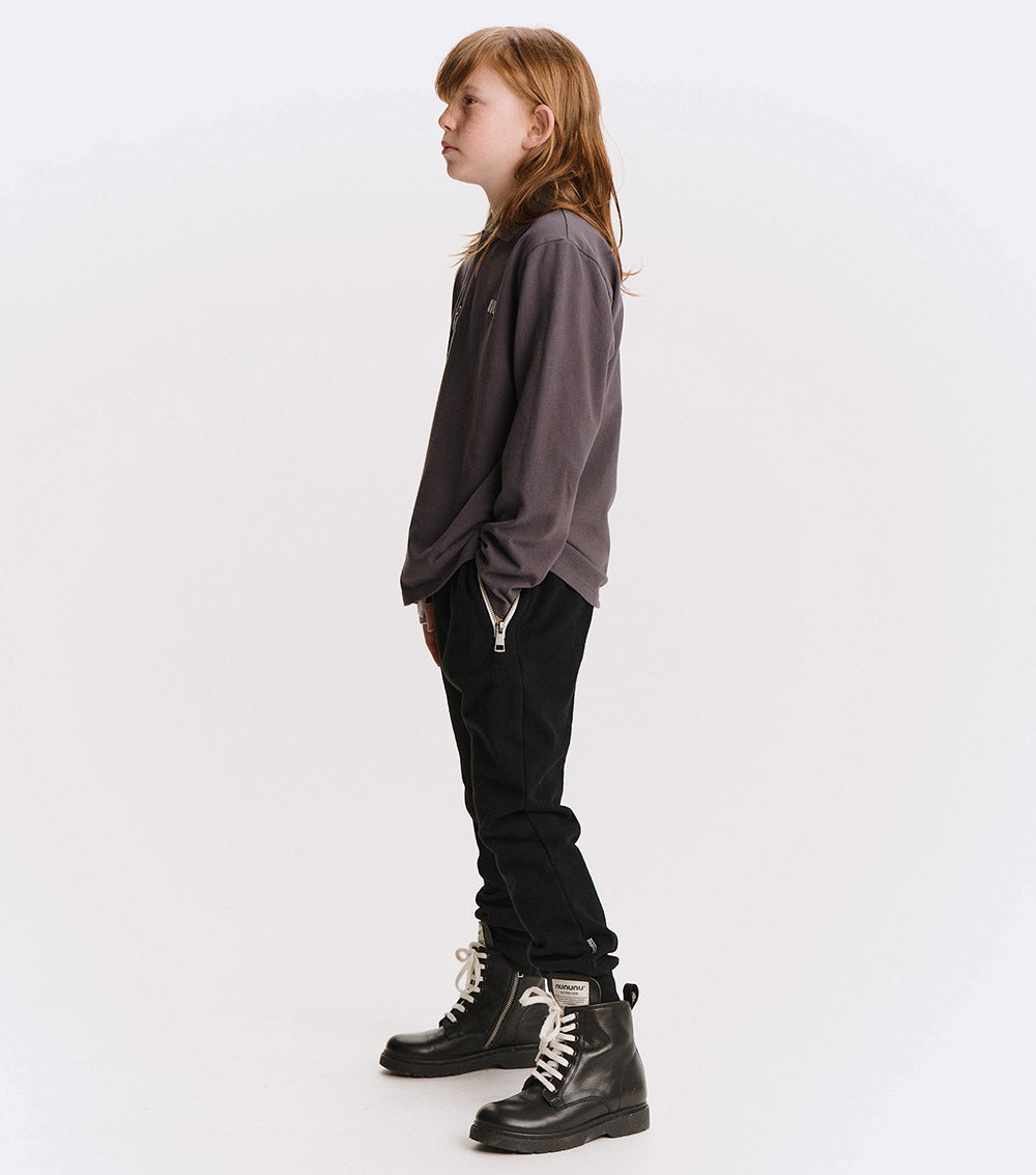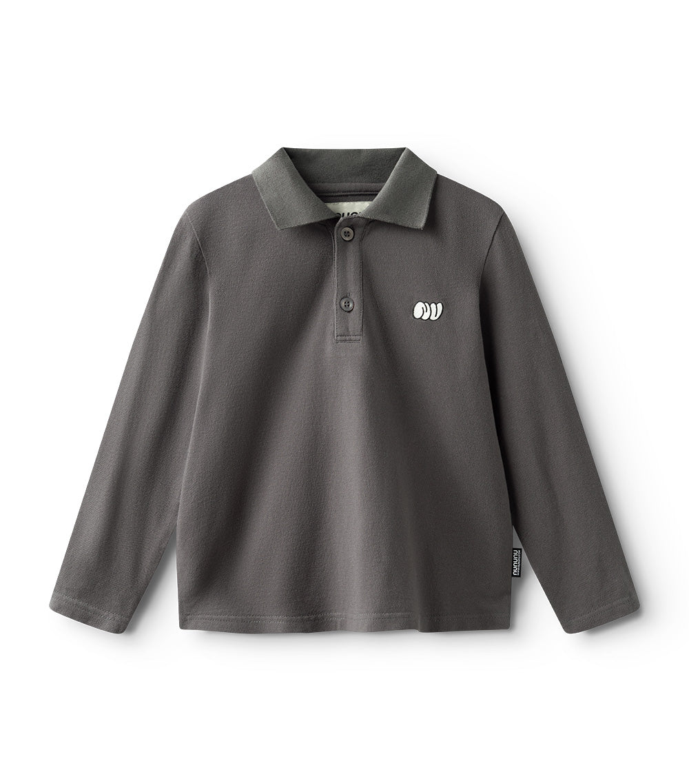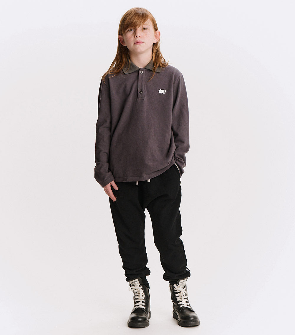 watch out dad’s closet, this shirt is coming for your all-time favorite look. it’s a classic, long sleeved polo made of a dark grey pique so it’s super breathable with a ribbed collar just waiting to be popped. it’s a gender neutral cut with a washed sort of look that gives it a pre-loved through the decades feel. it’s a little faded and a little vintage in a way that seems like maybe it was a back to the future vibe.