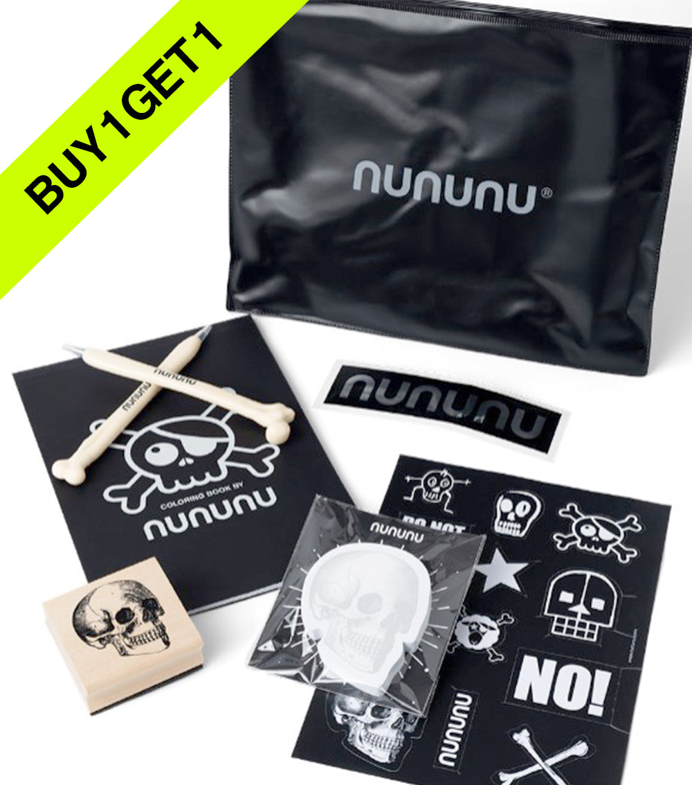 take your creativity to the next level with the ultimate nununu stationary kit! this edgy, all-black set is packed with everything you need to add some serious attitude to your everyday crafts. featuring a custom nununu coloring and activity book, bone-shaped pens, favorite print stickers, and a cool rubber stamp to leave your mark. this kit is perfect for the little rebels and grown-up trendsetters alike. it all comes in a sleek black pouch that’s as stylish as it is functional. embrace your inner artist with this fun set!