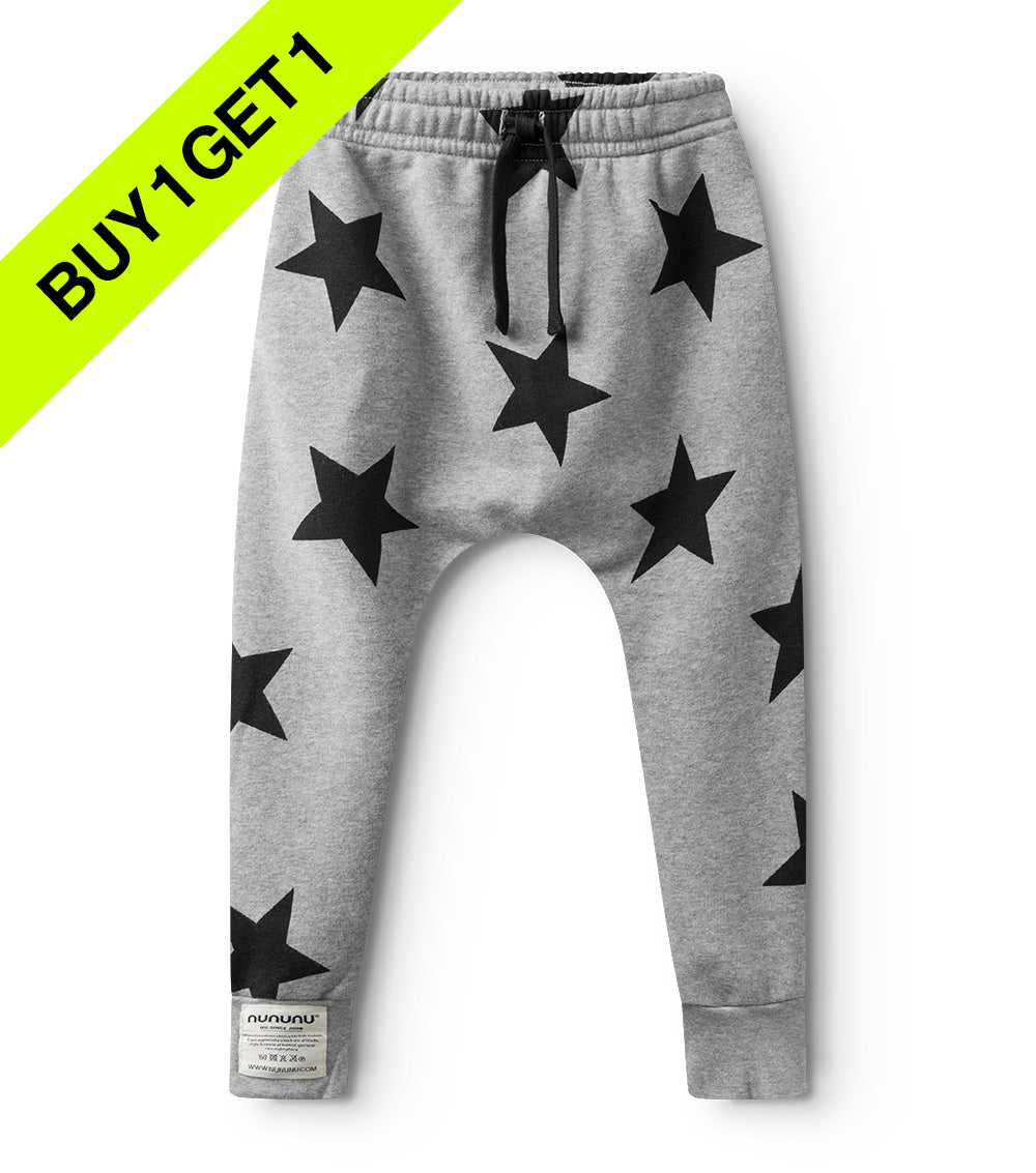 sometimes seeing stars is a good thing, because you can make all the wishes you want. it’s a classic nununu print splashed across yet another classic nununu piece, the heather grey french terry star baggy pants for boys & girls. they’re roomy & slouchy, giving legs the freedom they need to run, play & perhaps even sit still at times.