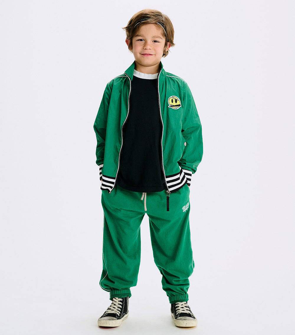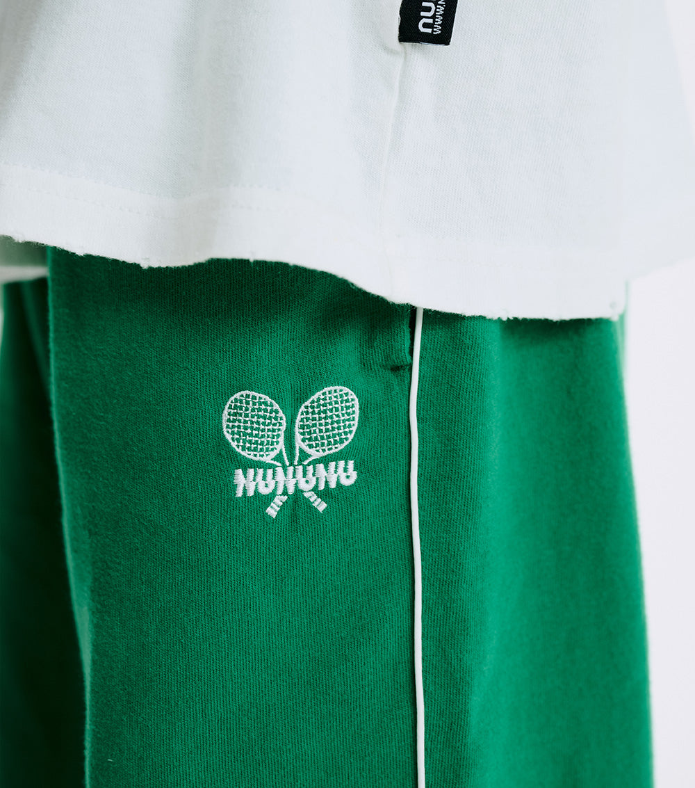 serve up serious style in these edgy green tennis pants. they’re made of heavy single cotton with an old school kind of cut & an elastic waistband that stays put. they’ve got ultra-thin outlines on the side to give it that retro sporty vibe and a super cool embroidered patch on the leg with our dueling tennis rackets logo that screams ready for a challenge. the look is complete with hidden pockets, the perfect place to stick hands into after yet another humble win.