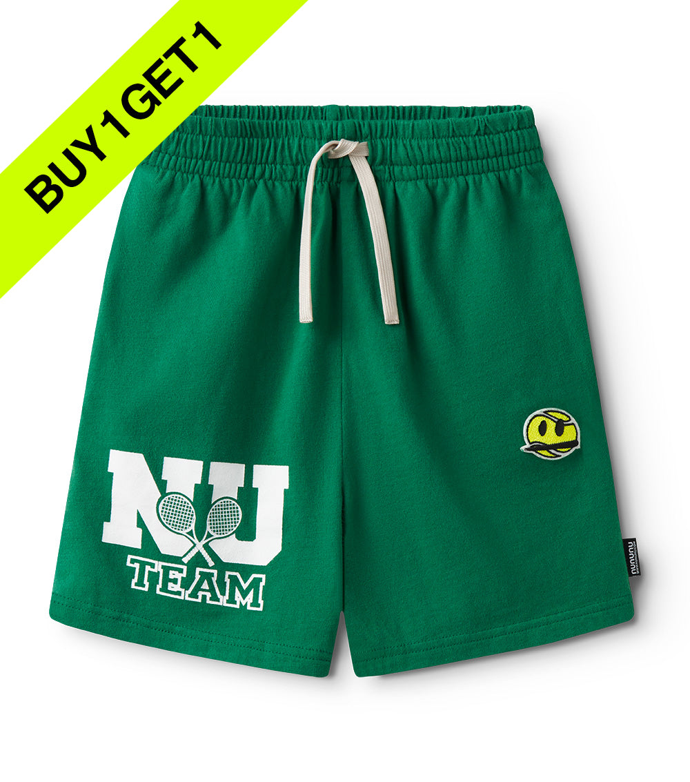 get ready to rally like a pro with these classic tennis shorts. they’re made of green heavy single cotton that moves with you and features a comfy elastic waistband to ensure they stay put long past the final point. we upped the cool factor with our dueling tennis rackets print atop the words nu team in our collegiate style font. better yet, we’ve got our embroidered tennis ball mascot patch smirking up front to cheer you on all match long. oh yeah, and hidden side pockets are the perfect place to stash victory snacks.