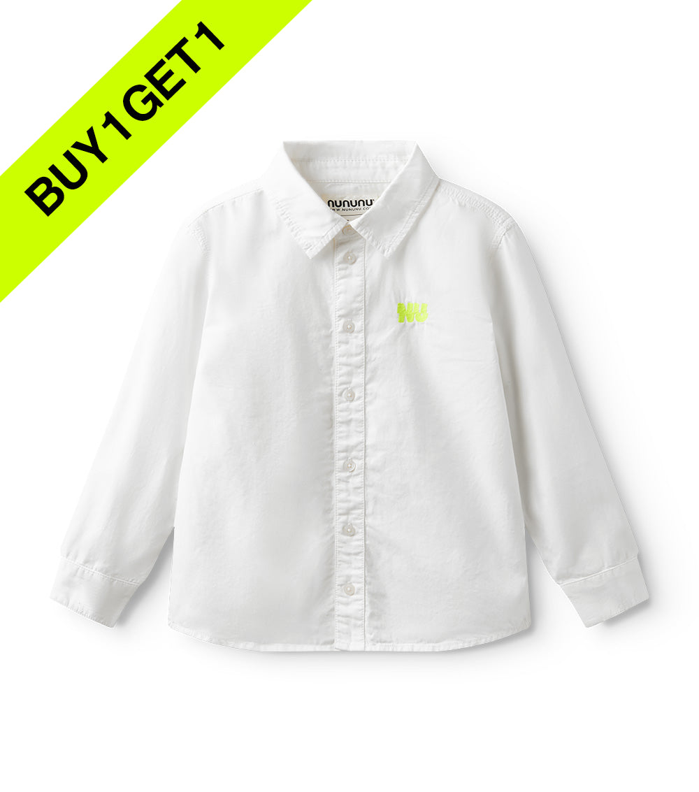button up, but make it cool. this isn't your stiff, scratchy oxford - it's woven, but soft like your kid's fave tee. made to move, made to chill, made to impress. wear it to a wedding or the playground. nu pops loud in hot lime, embroidered right where it counts. no frills. just a clean, classic look with a nununu twist. play hard, look sharp.