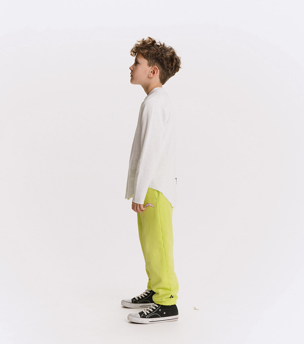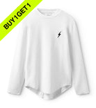 the kid wearing this shirt is sure to have a massive grin on their face while spinning around in circles. yeah they’ve got limitless energy. so we represented that total vibe with this gender neutral white long sleeve shirt. it’s got a bolt vibe going on with the lightning icon print on the chest. oh yeah, and it’s got a seriously rounded hem with raw edges that match the rawness of the sleeves. to keep it extra dizzying, the seam runs straight through the back of this wild & free shirt.