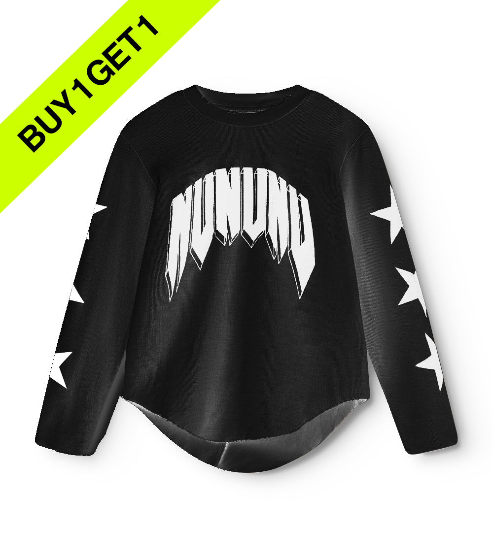 pull out that guitar & plug it in because it’s time to rock! we've got our totally edged up rawk logo bold & beautiful on the front of this unisex black t with our signature stars on the sleeves to match the oh so electric vibe. it’s made of super comfy & soft slub with raw hemlines perfect for all those long garage jam seshes. to keep it grungy we’ve got a super rounded hem at the bottom with the front a bit shorter than the back. if it's not already completely clear, the kid wearing this t marches to the beat of their own drum.