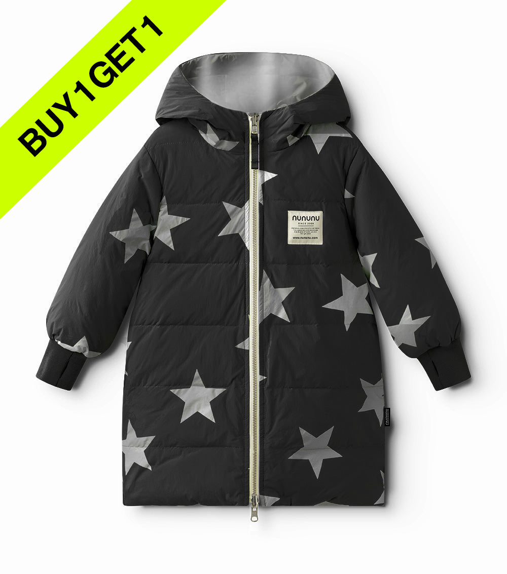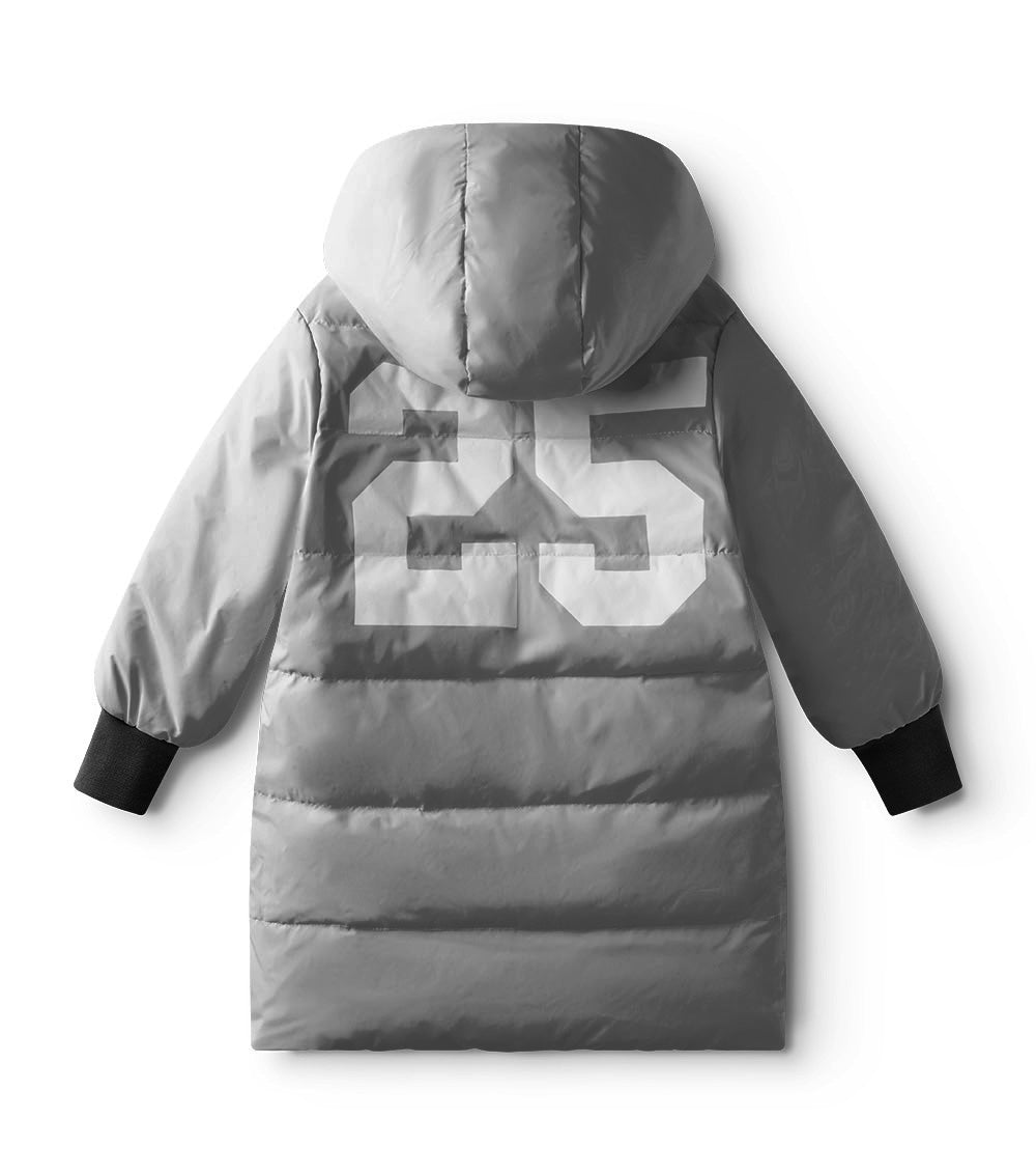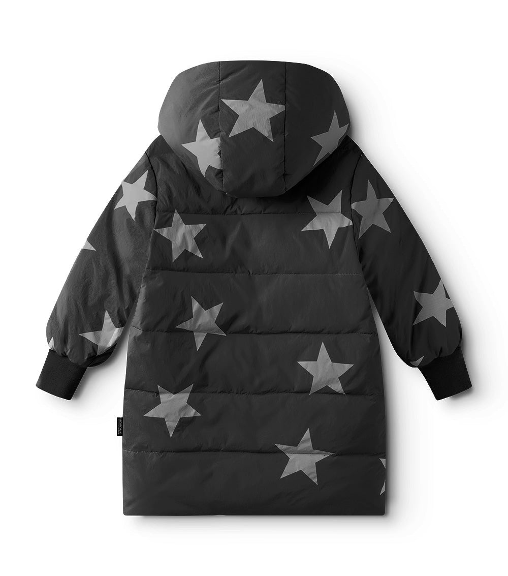 prepare to be totally starstruck by this dark grey and black gender neutral down coat with our signature star print spangled all over it. it’s nice & long with cool striped quilting details and a big hood to hide from the paparazzi. it’s warm & puffy but still feels light. the inside design is a grey with the number twenty five 25 which screams out the number of the kid on this team. it's got side pockets to stash a ball or pen for signing autographs. this coat is definitely one not to be missed as you'll definitely be able to re-use it for many seasons the star way or the 25 way.