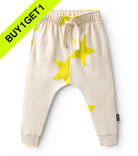 nothing like a good pair of sweatpants "wanna be's" to keep baby cozy & cool. made of amazing cloud-like and super natural soft cotton, they have all manner of creative seaming, snug cuffs & a drawstring waistband to keep them in place. our signature star print is splashed all over, just to remind you who your north star really is and how to make sure they're nununu'ed from since they are here!
