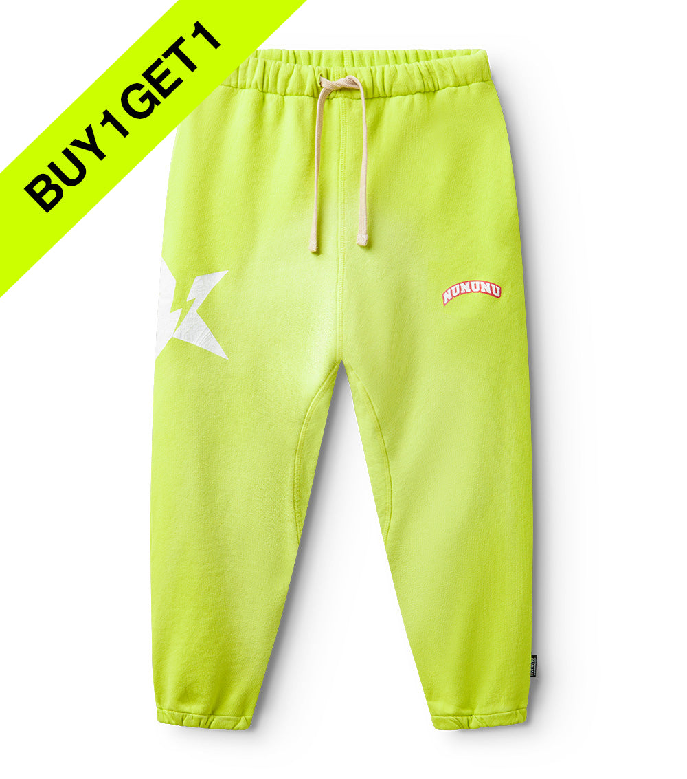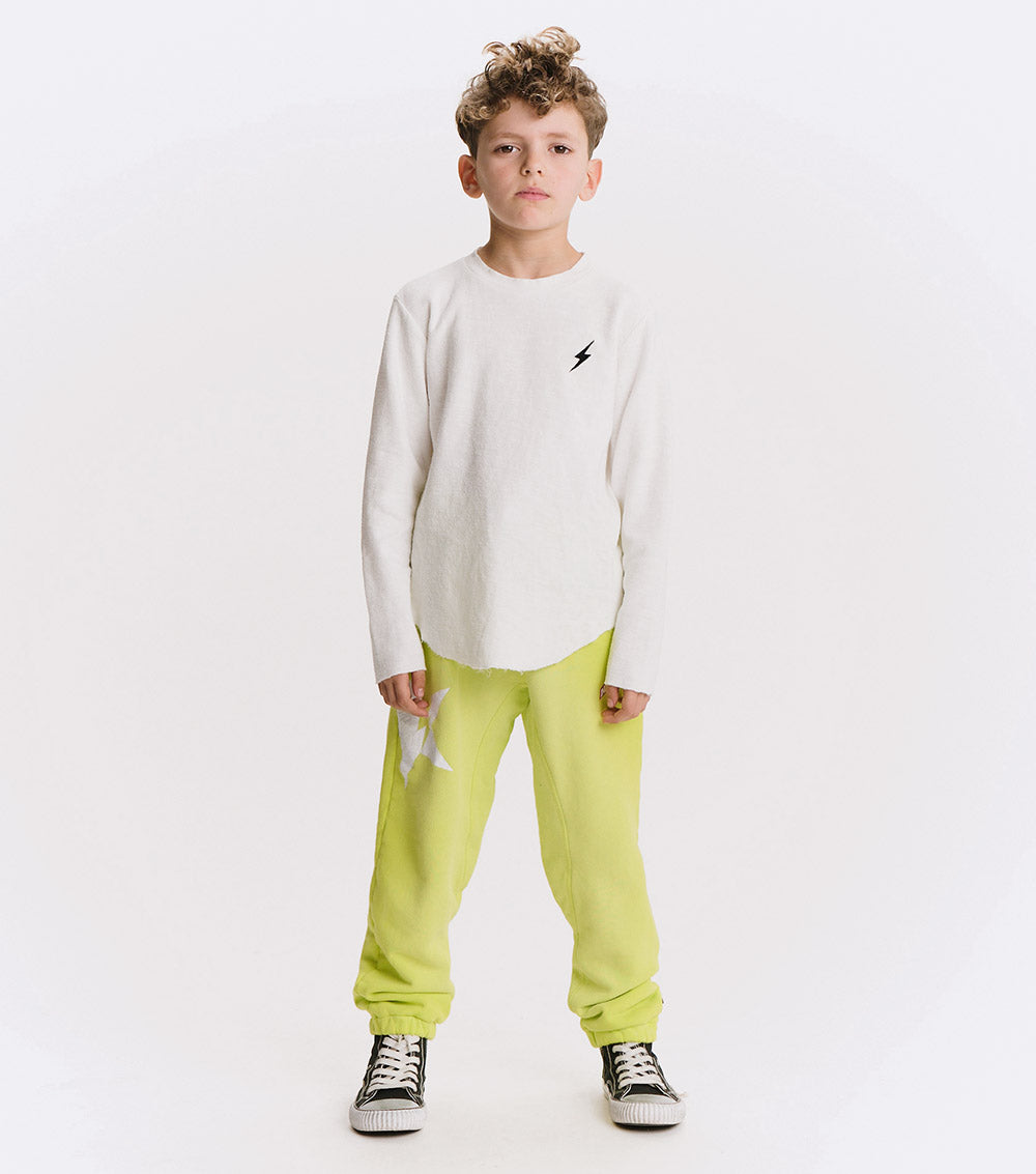 our classic sweatpants are now fully charged. it’s made of lime colored french terry with side pockets and our signature star print on the side. the bold star gets hit with a lightning bolt for an extra energy surge your kid didn’t know they needed. the lighting leaves behind a washing effect on the front & back of the pants. a diagonal seam slices through the middle, upping the edge factor. feels like power. wears like a dream.