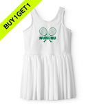 hey there tennis queens, get ready to hold court in this fierce white tennis dress. the top is a rounded neck tank top look made out of activewear with our dueling tennis racket logo printed in eye-catching green. the bottom is an old school pleated skirt made of extremely soft material with a silky crepe feel that’s ready to swish with every swing. underneath it’s got a built-in shelf up top and shorts on the bottom with tennis ball sized pockets on each side so you’re always ready for your next ace.