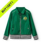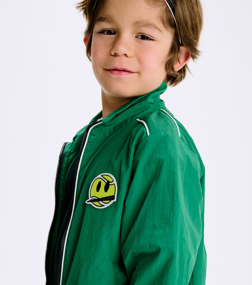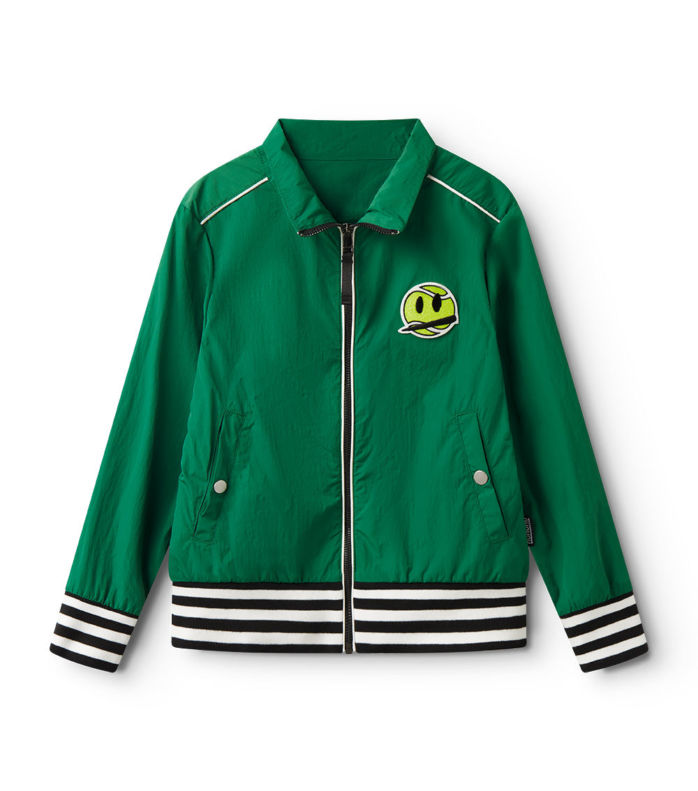 get ready to make some racket in this sporty retro zip jacket. it’s made out of thin nylon with a collar that comes up halfway to ward off winds or keep things cozy after an evening practice sesh. the black zipper is outlined in white while two thin white stripes peek out on the shoulders for that track suit look. the black & white striped rib on the wrist & bottom hems give it that beautiful contrast and the back features our nununu dueling tennis rackets logo print. to keep the cool factor at absolute max it's got our embroidered tennis ball mascot smirking on the front. oh yeah, and it’s got hidden snap button pockets on the front to stash pre-match fuel.