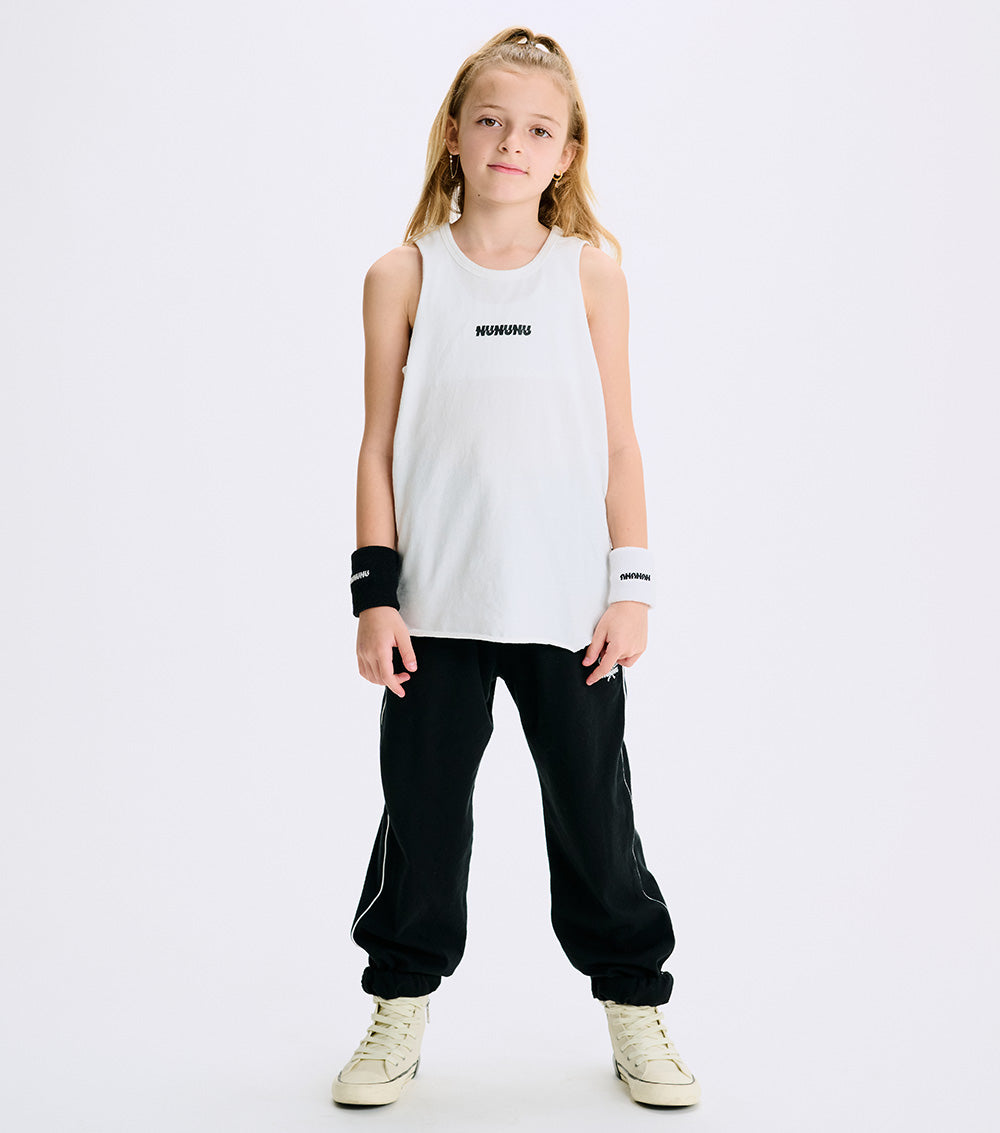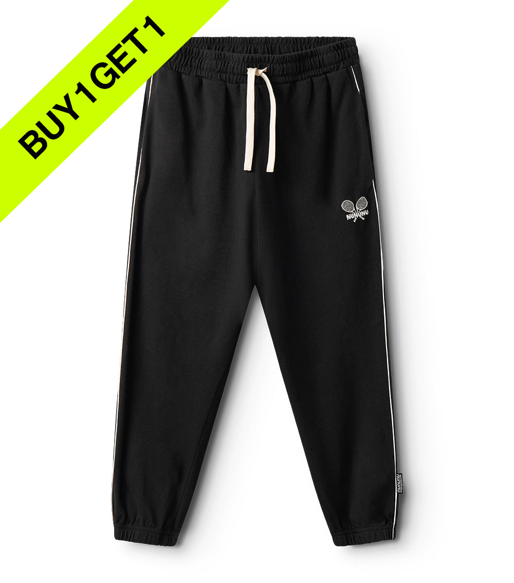 serve up serious style in these edgy black tennis pants. they’re made of heavy single cotton with an old school kind of cut & an elastic waistband that stays put. they’ve got ultra-thin outlines on the side to give it that retro sporty vibe and a super cool embroidered patch on the leg with our dueling tennis rackets logo that screams ready for a challenge. the look is complete with hidden pockets, the perfect place to stick hands into after yet another humble win.