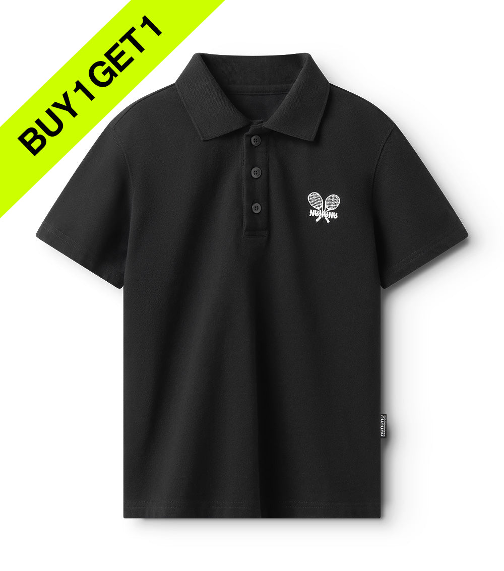 need a look that screams country club connoisseur? this is it. it’s a polo shirt made of black cotton pique so it’s extremely soft, flexible & cozy for all day play. even better, we've ditched the usual polo cut in favor of a t-shirt kind of vibe on the inner body but kept it classic with a soft rib collar, three tone-to-tone buttons, and clean edges. to top off this epic fit, our nununu dueling tennis rackets logo is embroidered in white on the chest, hinting at an impending challenge.