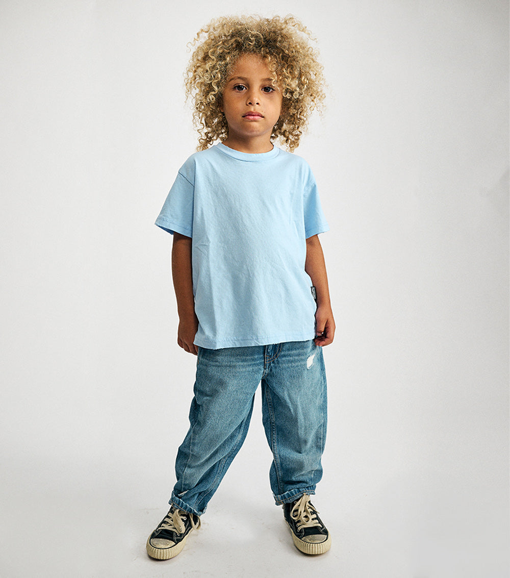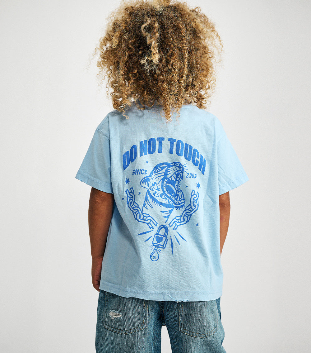 some kids purr, a nununu kid roars. a fact that’s written loud & clear on the back of this foggy blue cotton t-shirt. it’s the perfect cut with custom deconstruction details and a whole lot of don’t-mess-with-me energy courtesy of the words do not touch written in an arch above a fierce tiger breaking through chains with nothing but the power of love. kinda like your kid with unrealistic expectations, like “sit still” or “behave.” of course, the print on the back is striking blue just so no one misses out.