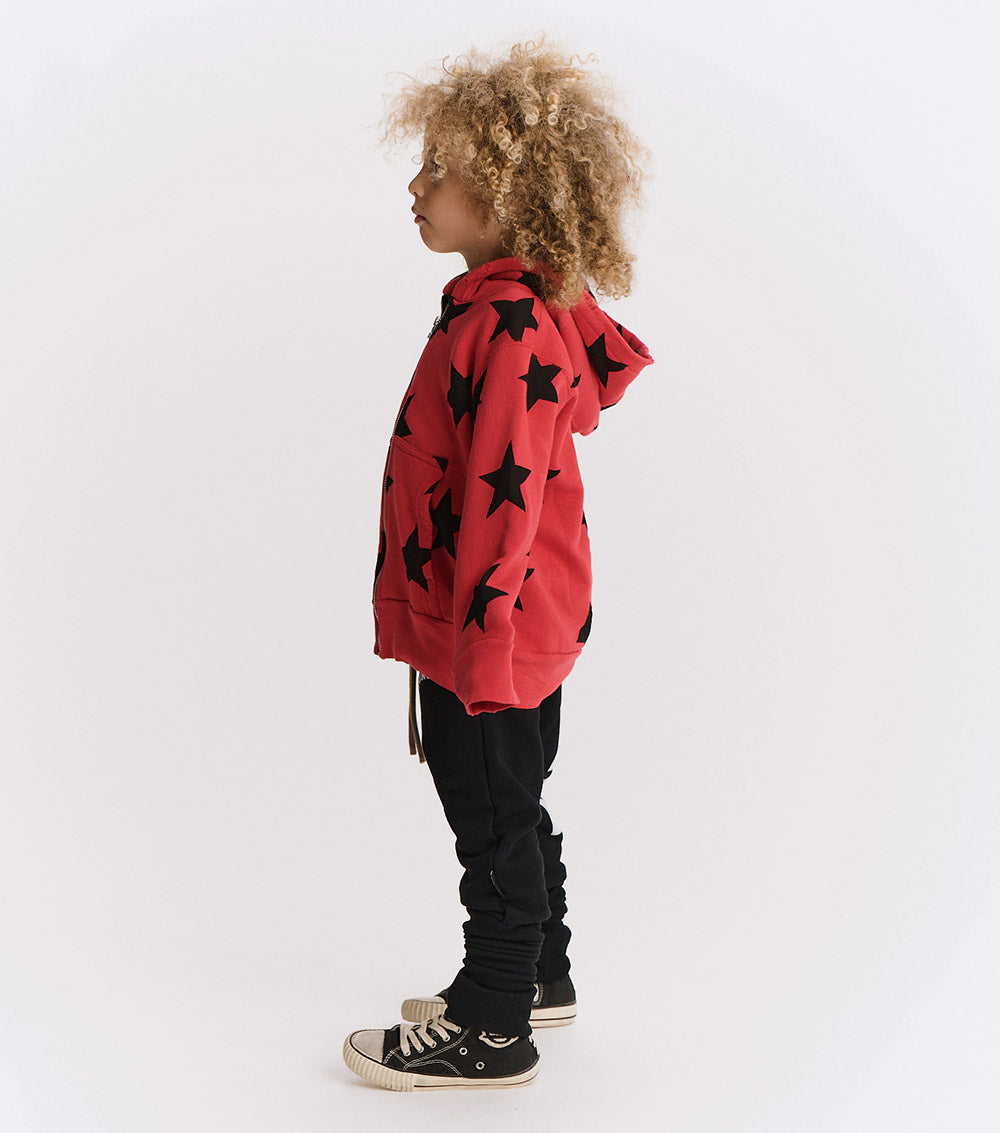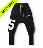 anything but your average sweatpants, this black french terry fit is built differently. the top is a basic rounded & roomy cut but the bottom flips the script with ultra-long ribbed cuffs you can style your way. wear ‘em scrunched or stretched. either way a drawstring waist keeps them up while pockets keep it functional. 25 takes over one leg, bold & unapologetic. nununu arches across the other in a sporty, collegiate style print. comfort & attitude make the perfect match in these effortlessly cool pants.