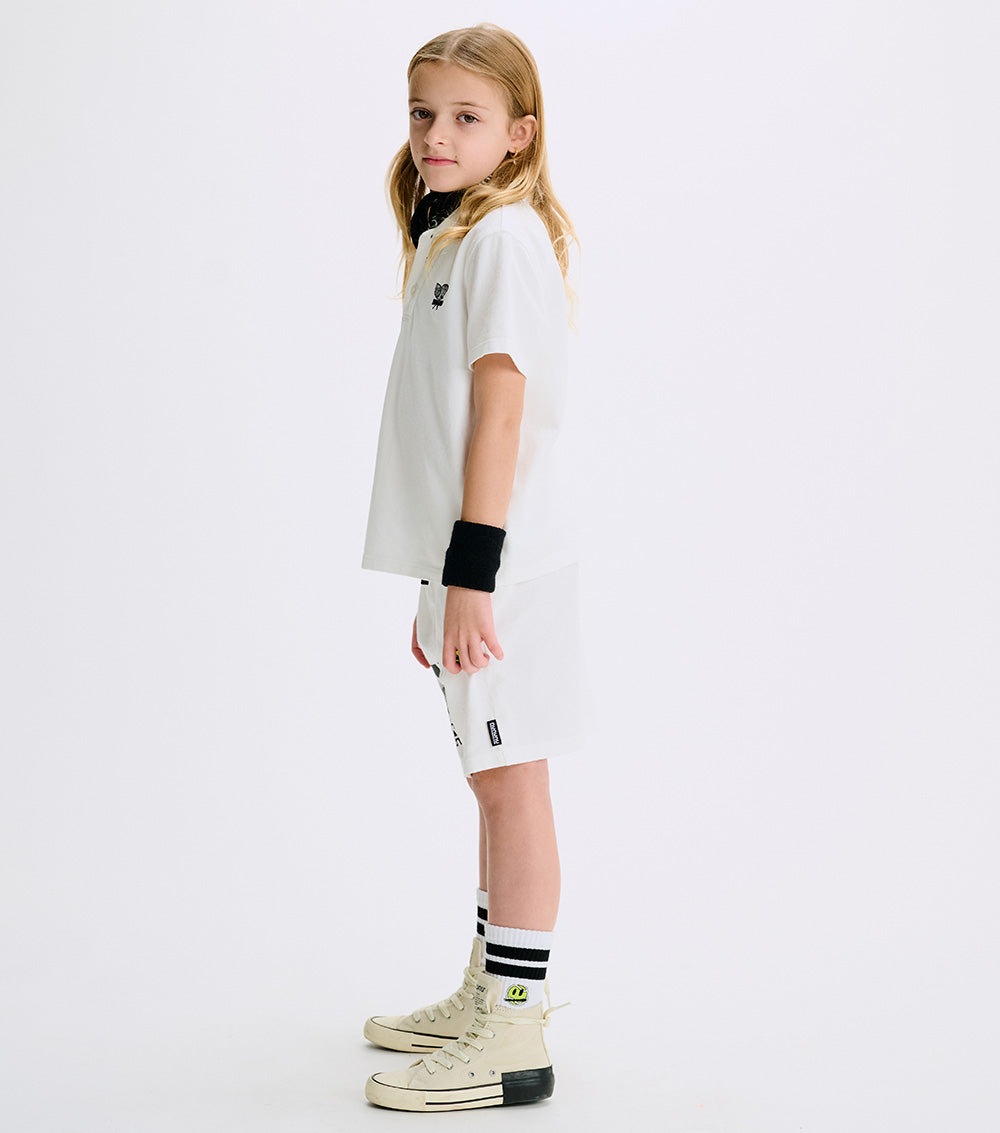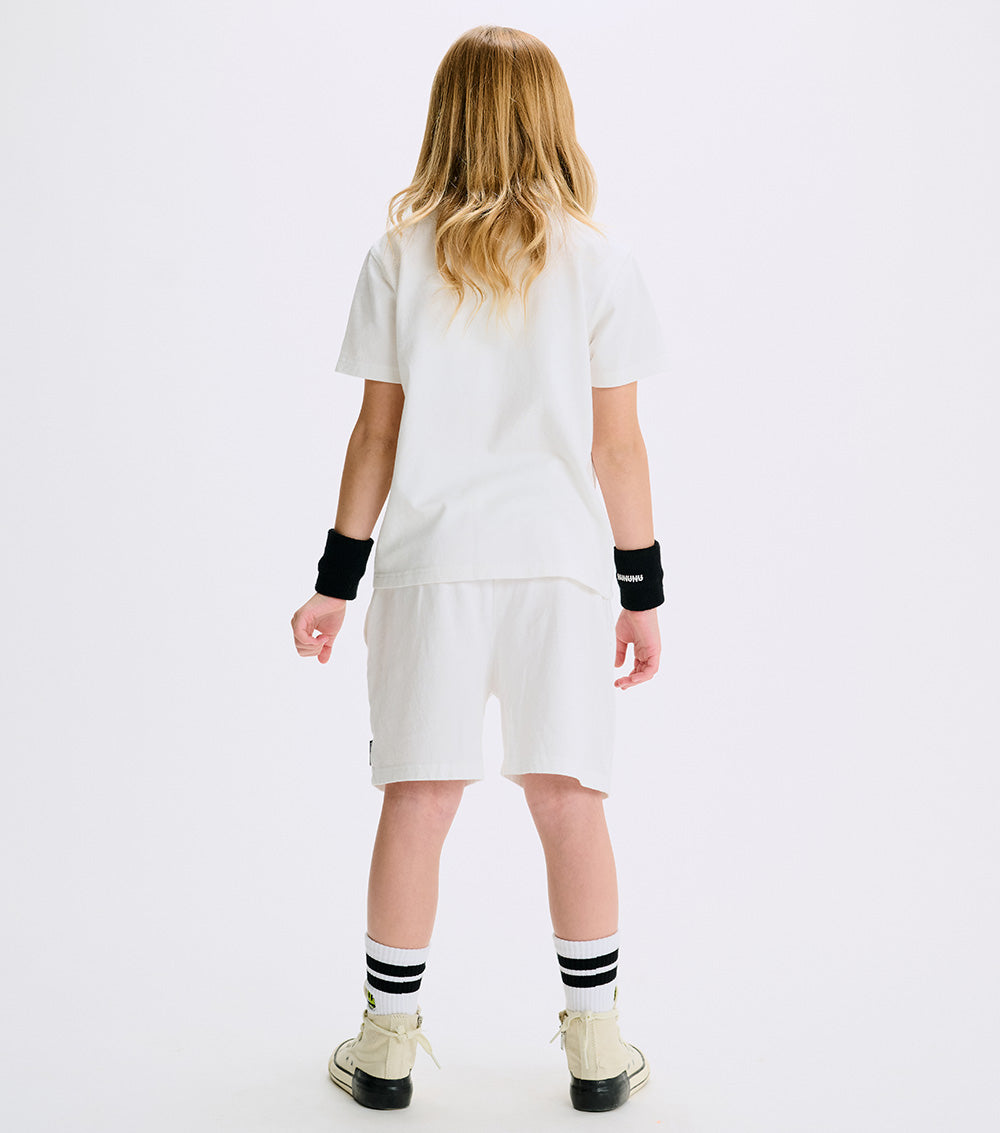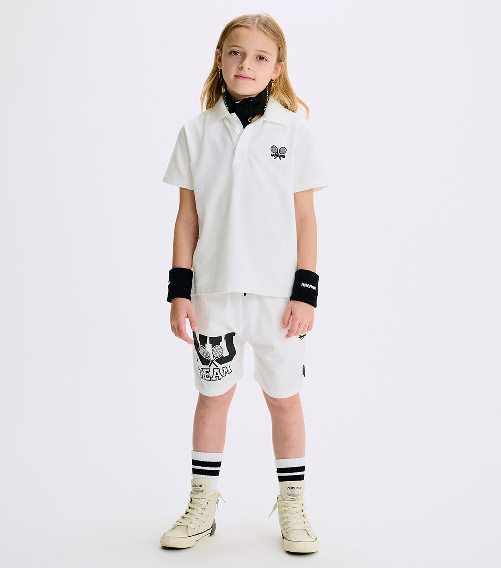 get ready to rally like a pro with these classic tennis shorts. they’re made of white heavy single cotton that moves with you and features a comfy elastic waistband to ensure they stay put long past the final point. we upped the cool factor with our dueling tennis rackets print atop the words nu team in our collegiate style font. better yet, we’ve got our embroidered tennis ball mascot patch smirking up front to cheer you on all match long. oh yeah, and hidden side pockets are the perfect place to stash victory snacks.