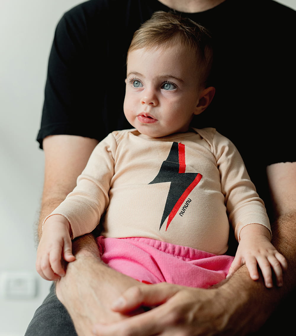 no need to worry about keeping the energy up, the baby wearing this gender-neutral fit is practically electric. that’s why we’ve got two bold bolts overlapping in black & white on this fine rib long sleeve onesie. it's a nude fit with convenient crotch snaps so changing is almost as fast as lightning. which is a good thing because the baby wearing this is always looking to squirm up a storm.