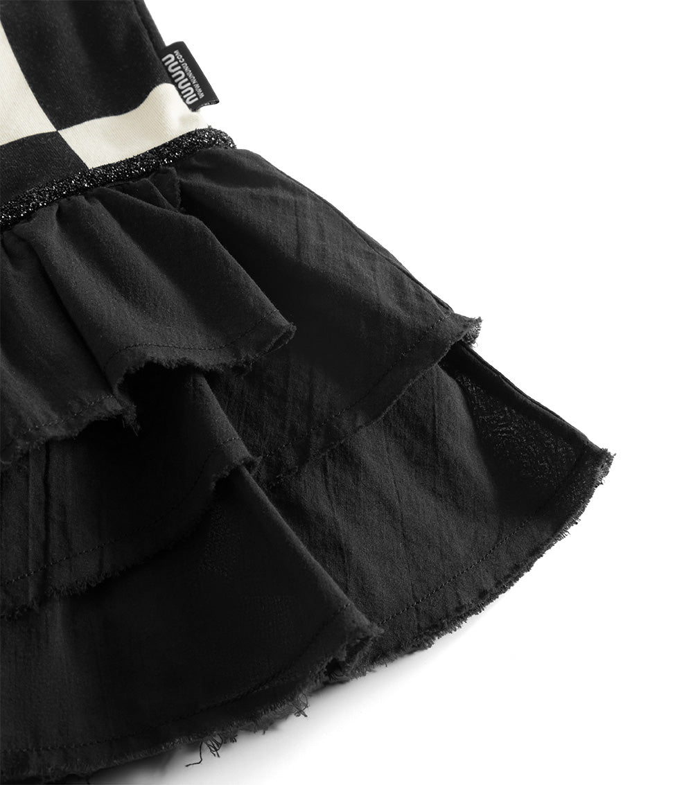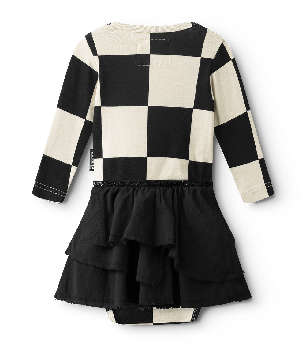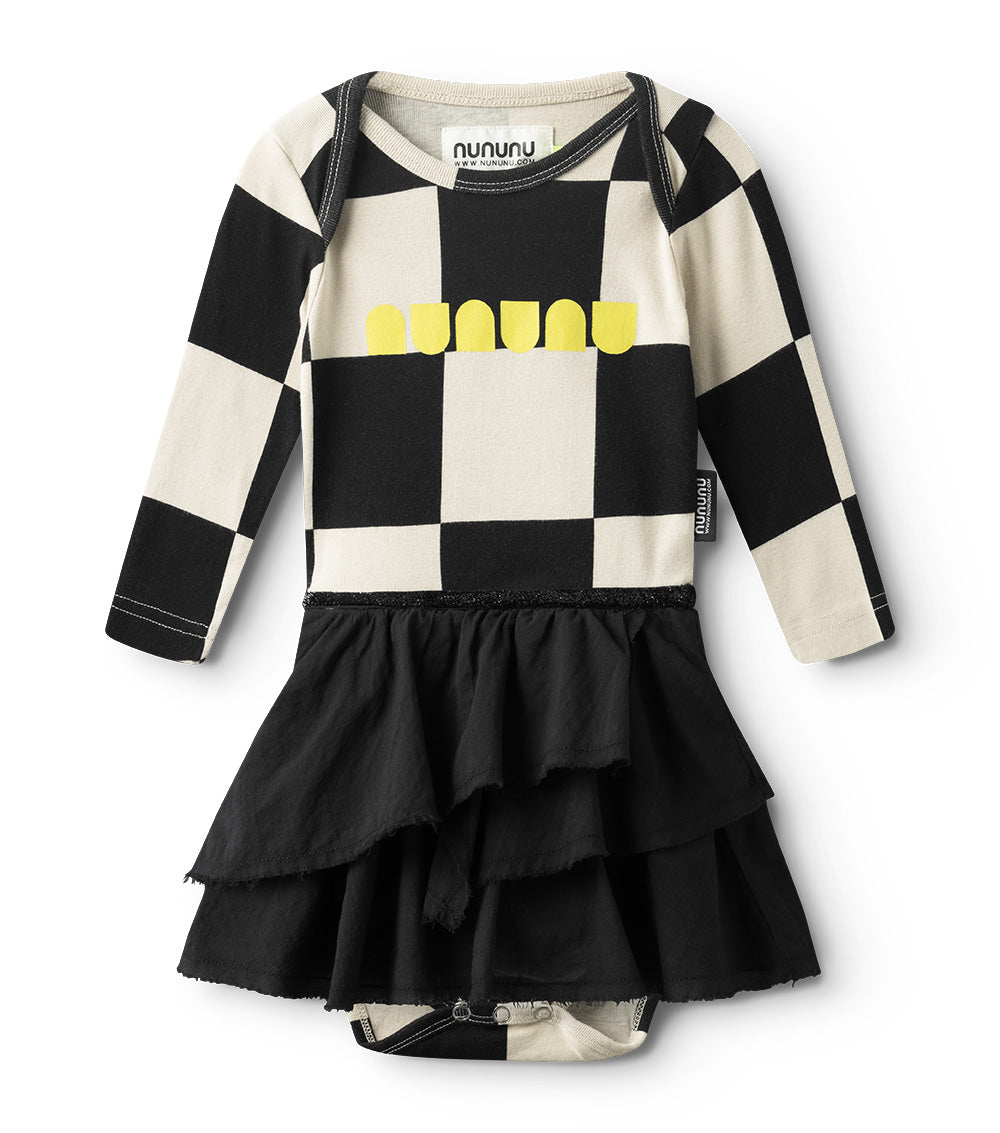 raising a winner with a rad sense of style? we’ve got exactly the onesie you’re looking for with this chess inspired fit. it's a smokey natural & black checkered fine rib onesie with our bright hot lime logo on the chest like teeth ready to warn the competition. it’s got a wide neck opening and in-between leg snaps to make changing your future champion easier than ever. and just because this kid is also a superstar, we’ve added a multi-layer black skirt made of voile. perfect for twirling up a storm as soon as they’re ready.