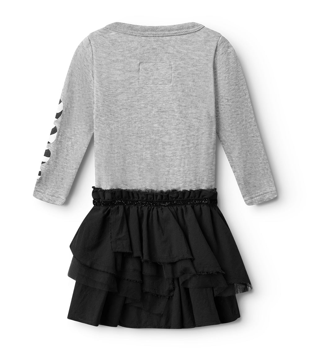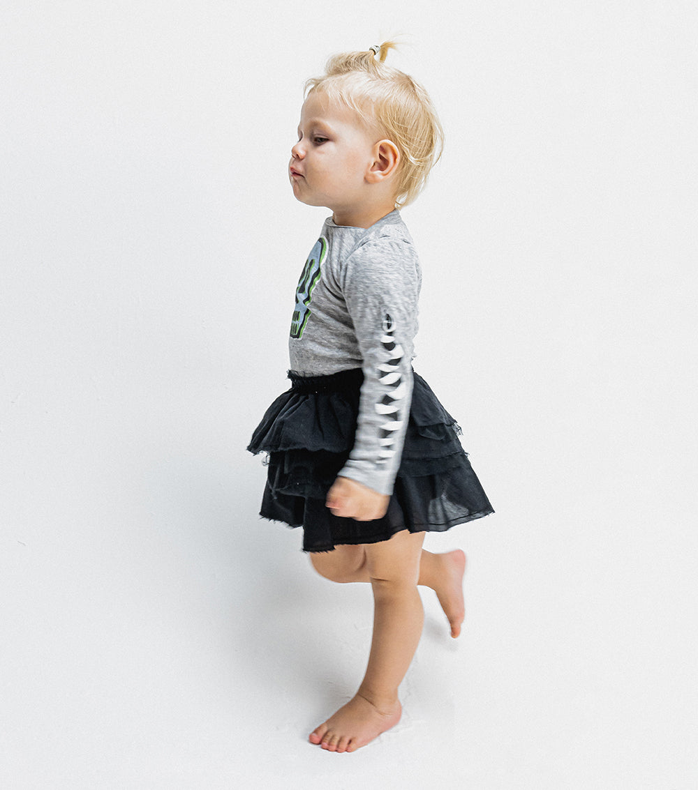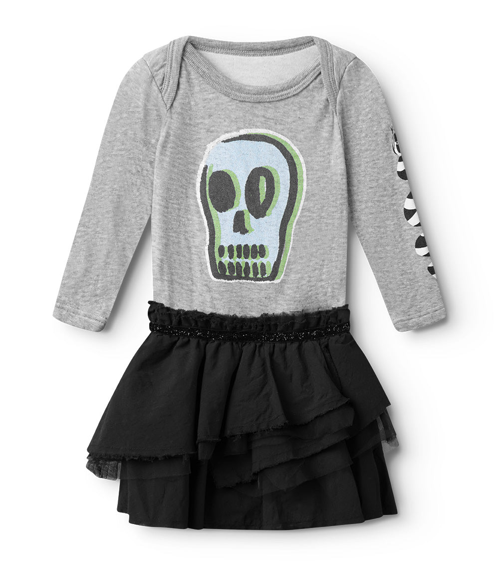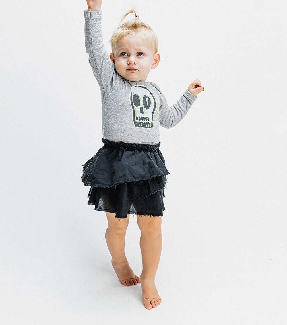 sometimes your baby is feeling sweet & a little sour too… we’ve got the perfect thing to pull on and go when your baby just can't decide on their mood. a heather grey long sleeve onesie made with a super comfy double-single cotton. complete with our dizzy skull print made in collab with artist shay id alony. it’s got extra fun layers of voile for the skirt. so it’s finally time to teach your tiny dancer to twirl…