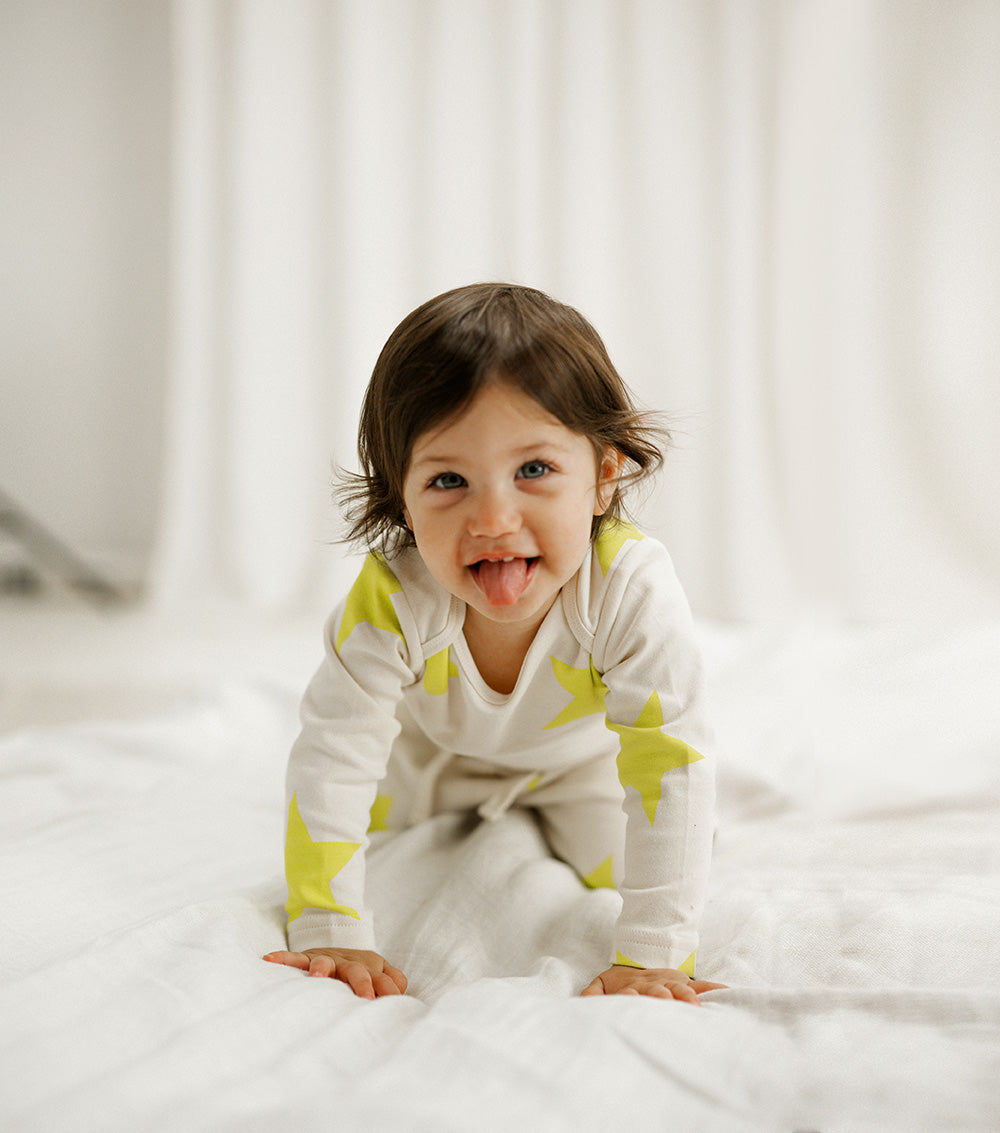 wrap your little star in cloud-like comfort with our extra soft natural onesie sprinkled with the all-time favorite nununu star print in pink. crafted with from extra soft fabric, perfect for delicate baby skin – no itchy tags or seams on this one plus it’s got perfect little crotch snaps so changing is as simple as can be. which is a huge plus since we’re sure your tiny human is always ready to kick & scream as little rockstars do.