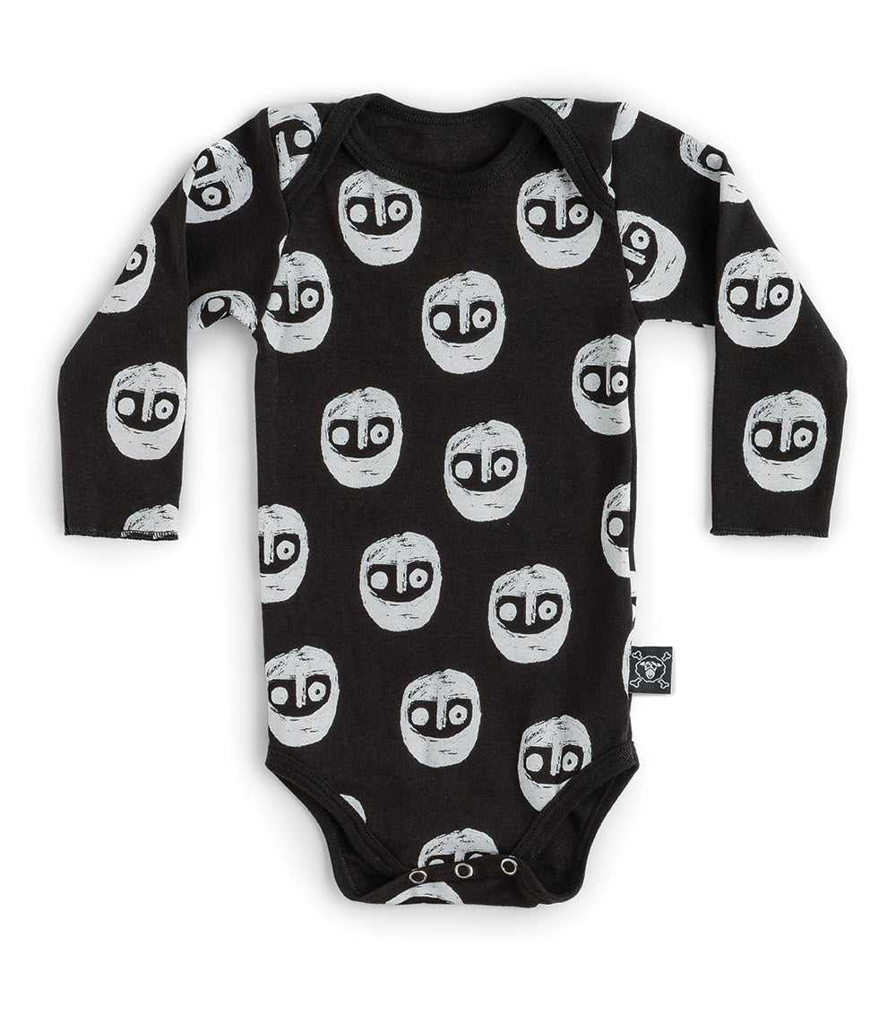 today’s babies are eventually going to hear lots of stories about the crazy times in which they arrived. our warrior design, -a collaboration with artist shay id alony- is a symbol of the current global culture of face-covering, comes printed all over this awesome black long sleeve baby onesie. it’s a classic shape that goes on with zero friction. snaps at the crotch make diaper changes a no-fuss situation, and shoulder flaps let you pull it down from the top—whatever’s easiest in the moment.