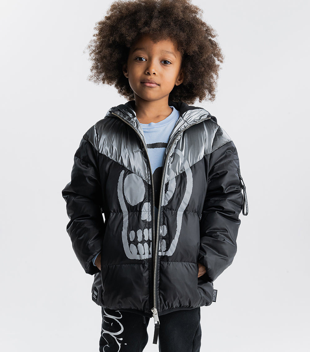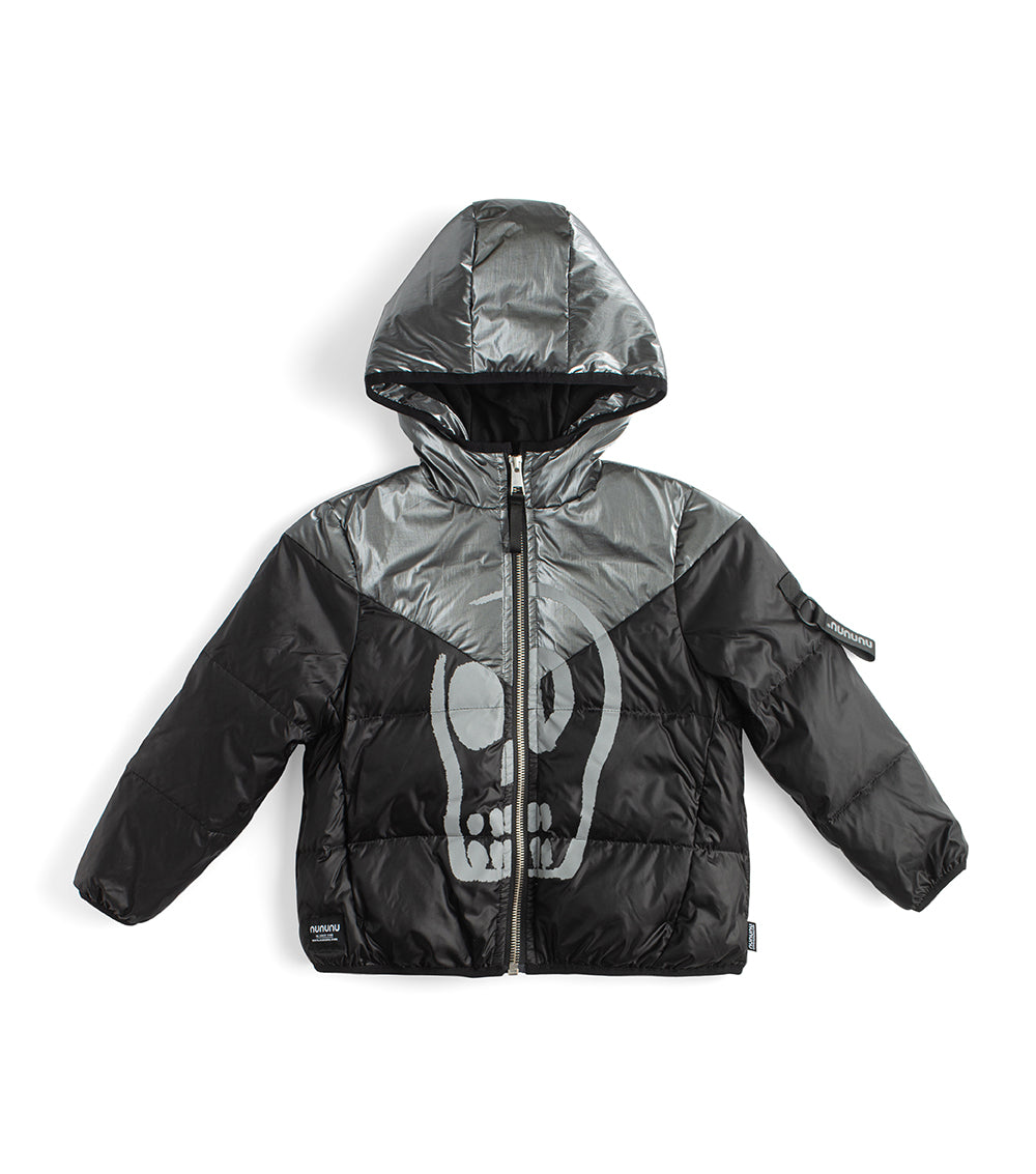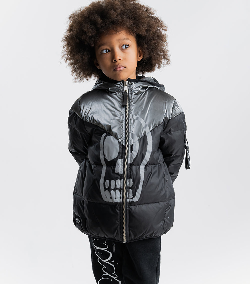 a basic black down jacket needs an absolutely killer upgrade. so that’s what we did with this completely rad dizzy skull jacket for boys & girls. it’s mostly black but it’s got a big titanium detail that covers the hood and comes down to a triangular point in the front and back. it meets up with the bold dizzy skull print on the front, split right through the middle by the big zipper. it’s got a longer length for extra warmth and for added flexibility & movement there’s elastic edges on the hood, wrist cuffs, and bottom hem. the logo loop care tag rides outside on the arm. oh yeah, and inside, there’s inner shoulder straps so kids can carry it like a backpack because they definitely won’t want to lose this killer piece.