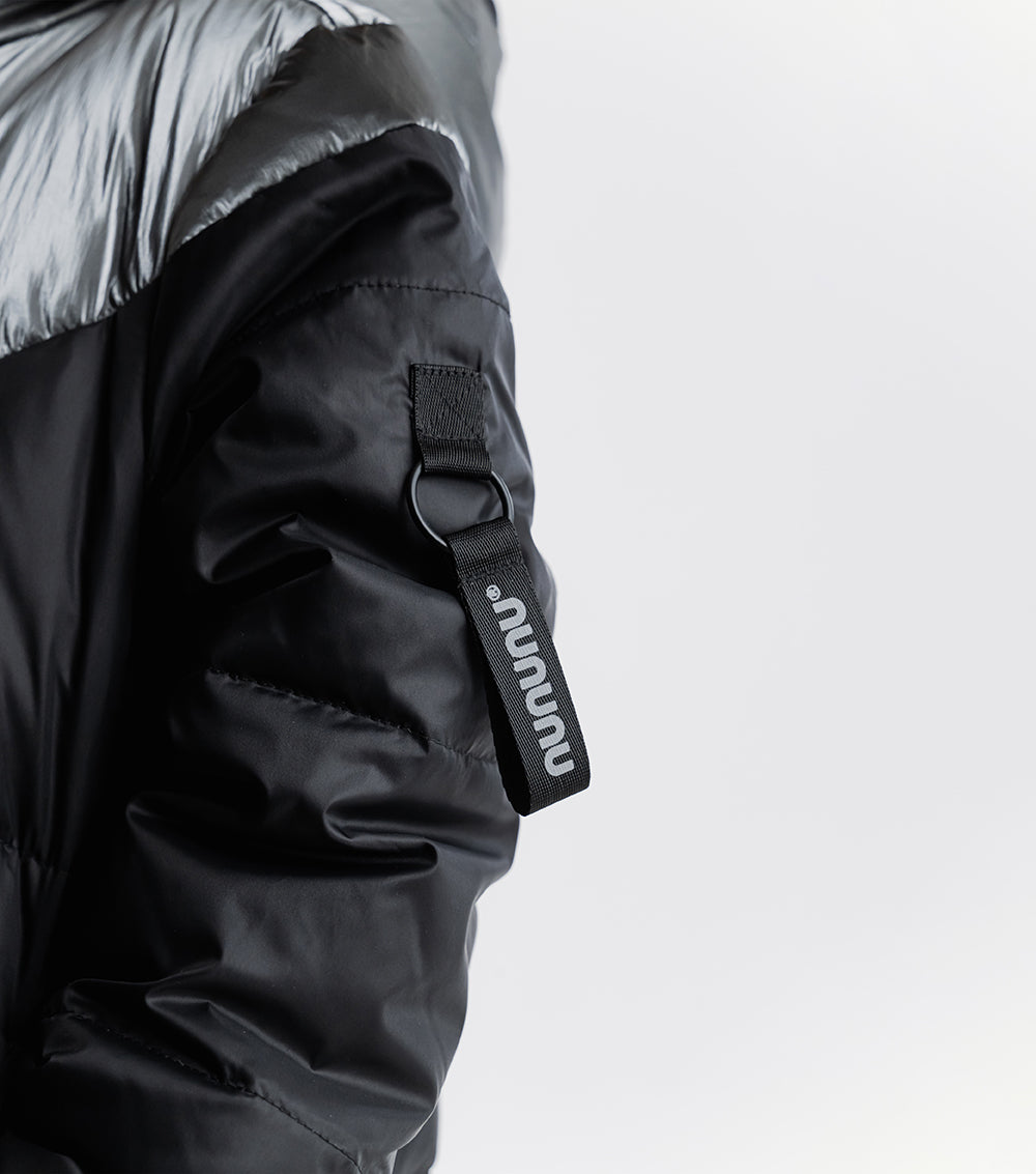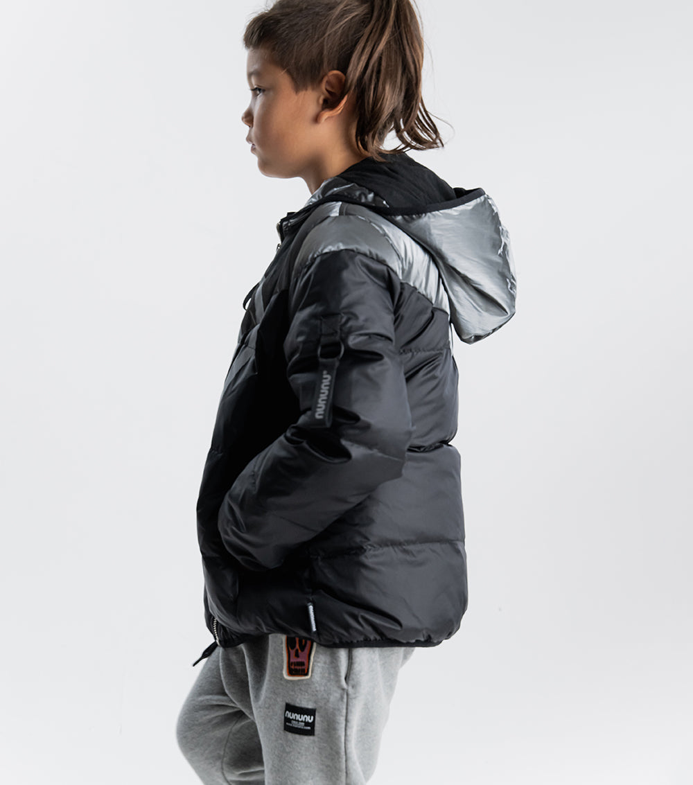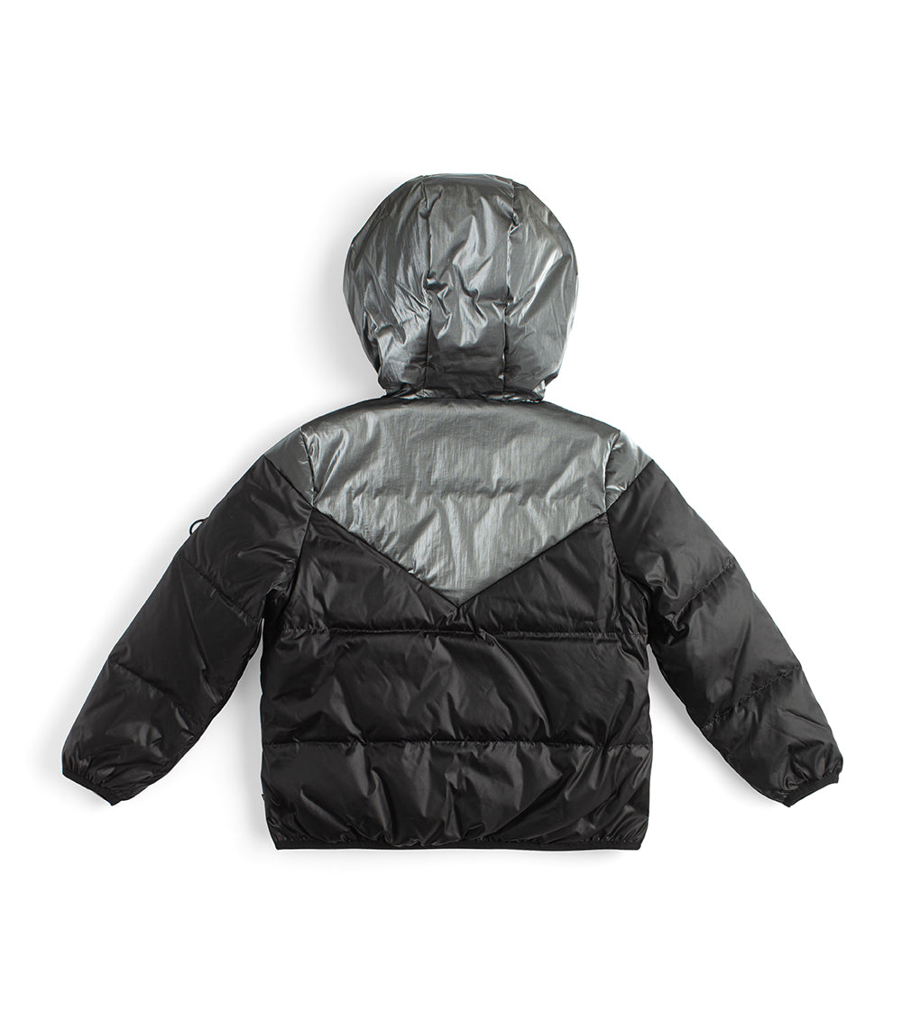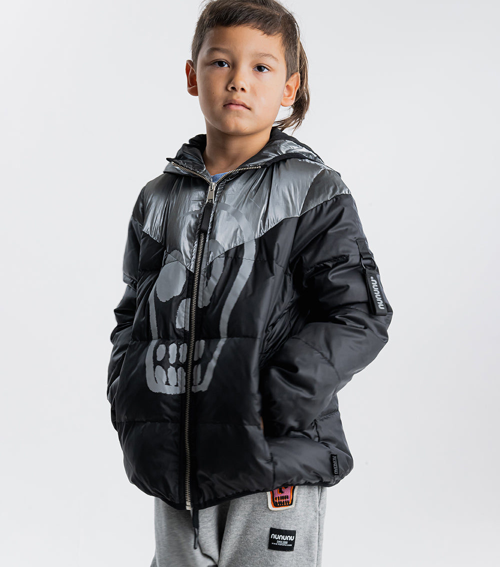 a basic black down jacket needs an absolutely killer upgrade. so that’s what we did with this completely rad dizzy skull jacket for boys & girls. it’s mostly black but it’s got a big titanium detail that covers the hood and comes down to a triangular point in the front and back. it meets up with the bold dizzy skull print on the front, split right through the middle by the big zipper. it’s got a longer length for extra warmth and for added flexibility & movement there’s elastic edges on the hood, wrist cuffs, and bottom hem. the logo loop care tag rides outside on the arm. oh yeah, and inside, there’s inner shoulder straps so kids can carry it like a backpack because they definitely won’t want to lose this killer piece.