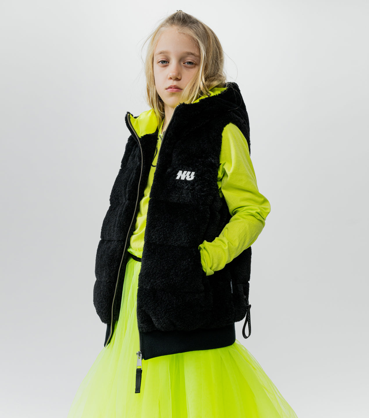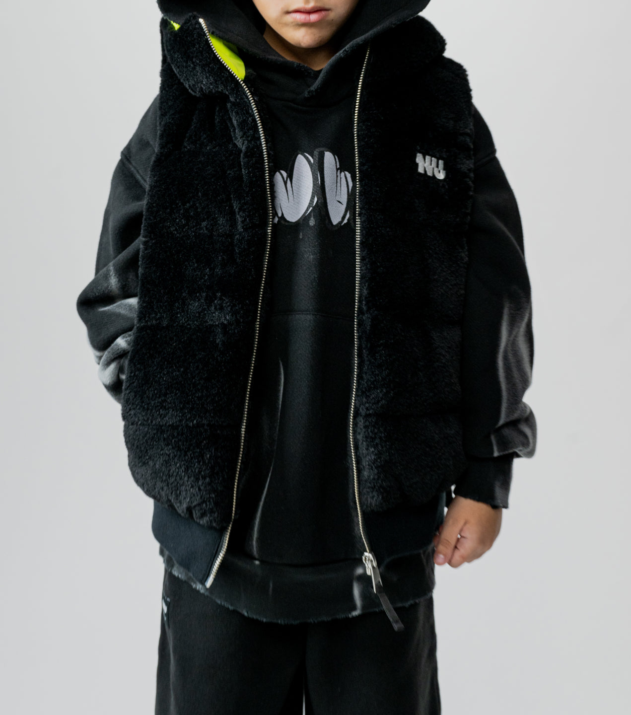 this might just be the most epically cozy thing you’ve ever seen or felt. it’s a gender neutral black shaved sherpa down vest with NU embroidered on it like it’s always in motion. just like the kid wearing this fit always is. that's why the bottom hemline is made of a flexible rib for maximum ease of movement. if that wasn’t already rad enough, we’ve got seams running across it for that down look plus the big hood’s inner lining is hot lime for a chic pop of color. it’s got two side pockets in the front with snaps for stashing beanies, mittens, and the like. oh and peep the super cool ring with our logo strap added to the down in back. of course, it’s got inside shoulder straps so they can wear it like a backpack because they would never want to lose this killer piece.