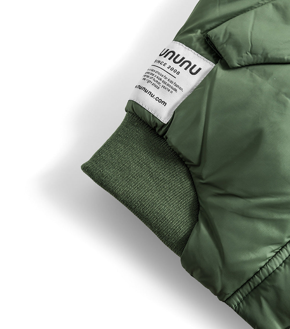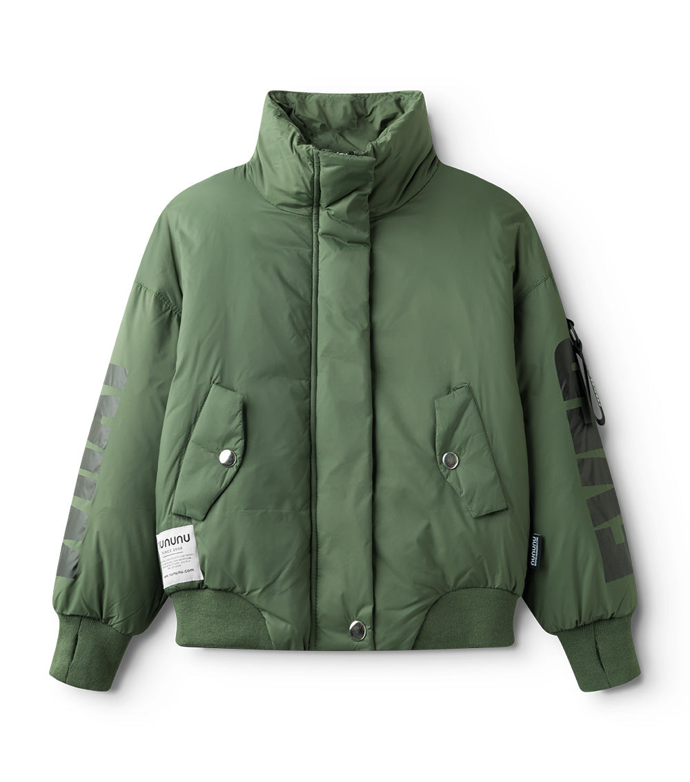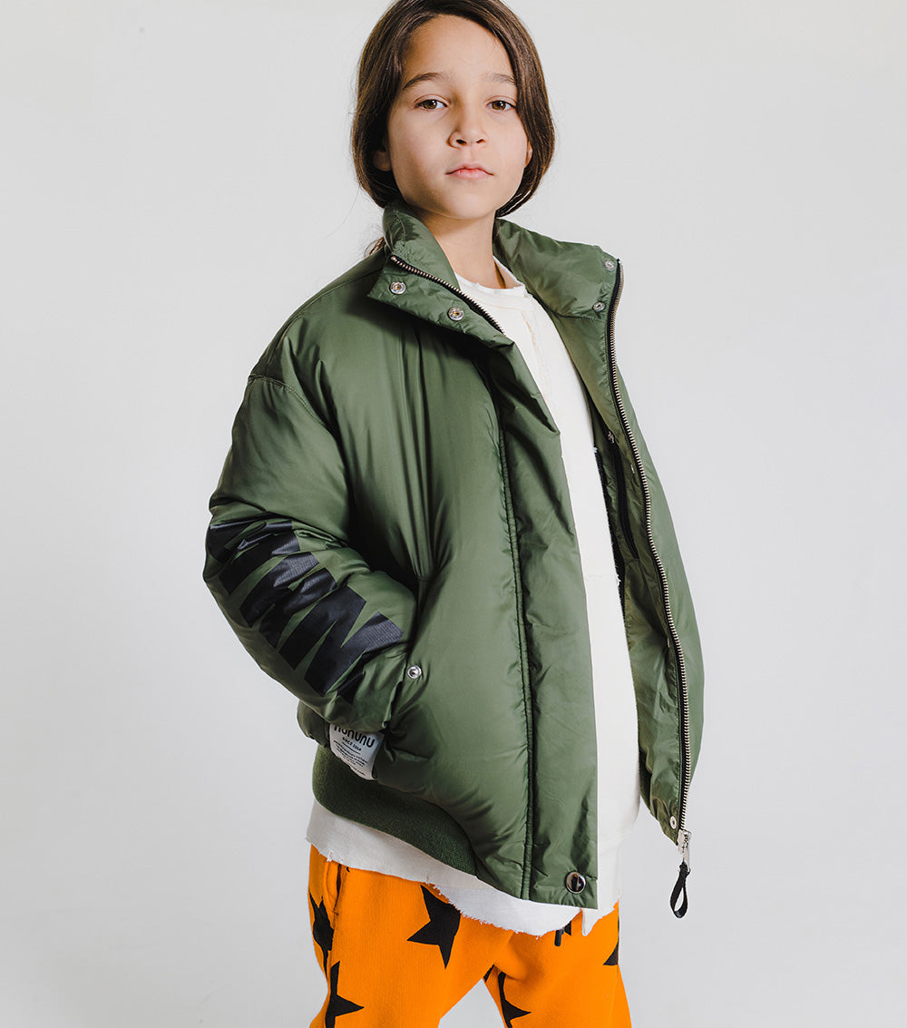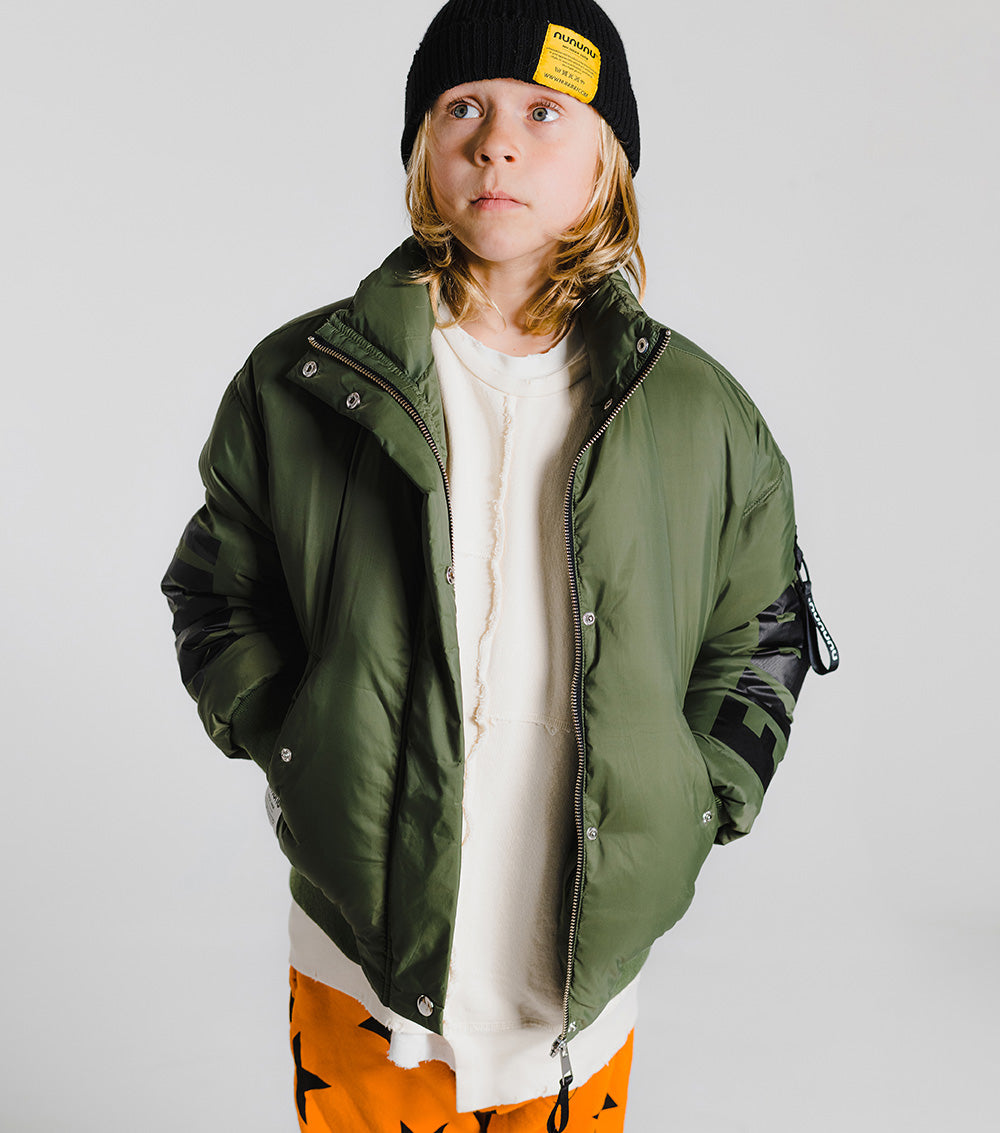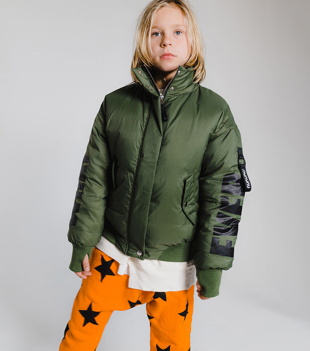 get ready to go to battle (a.k.a. school or playground) in this amazing military olive unisex down jacket that recalls the days of classic hiphop. puffy warm in shiny nylon, it’s got ribbed cotton cuffs hem for structure. snap pockets keep hands warm a zip/snap situation closes up to a high collar to protect the neck. on the sleeves, it reads “whatever” in big black block letters, because yeah, whatever. finishing touches include our pointy “nu” logo embroidered on the back, a logo loop on the sleeves the care tag riding on the outside in front. inside, we’ve got shoulder straps so kids can take it off wear it like a backpack so they don’t lose this killer piece.