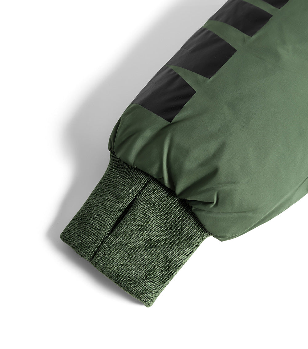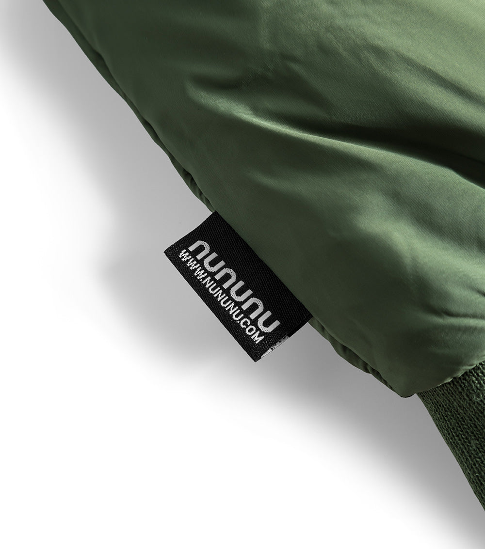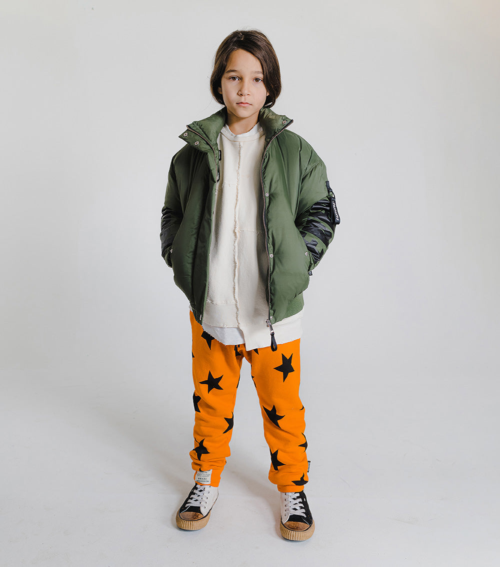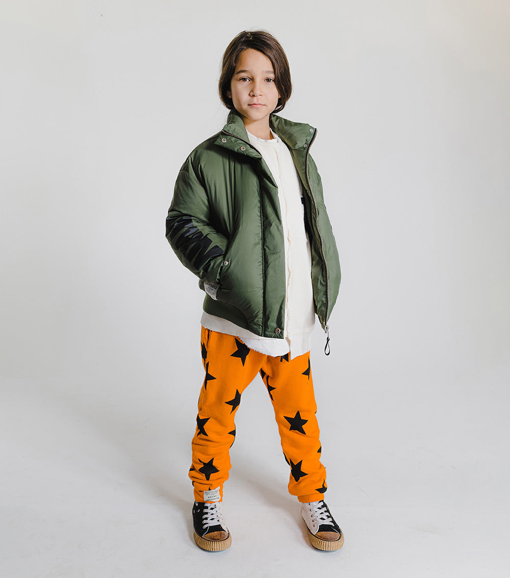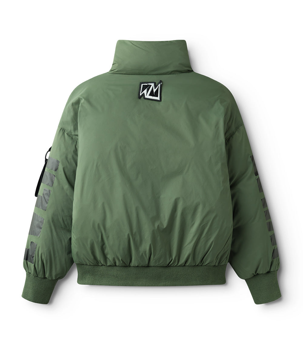 get ready to go to battle (a.k.a. school or playground) in this amazing military olive unisex down jacket that recalls the days of classic hiphop. puffy warm in shiny nylon, it’s got ribbed cotton cuffs hem for structure. snap pockets keep hands warm a zip/snap situation closes up to a high collar to protect the neck. on the sleeves, it reads “whatever” in big black block letters, because yeah, whatever. finishing touches include our pointy “nu” logo embroidered on the back, a logo loop on the sleeves the care tag riding on the outside in front. inside, we’ve got shoulder straps so kids can take it off wear it like a backpack so they don’t lose this killer piece.