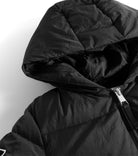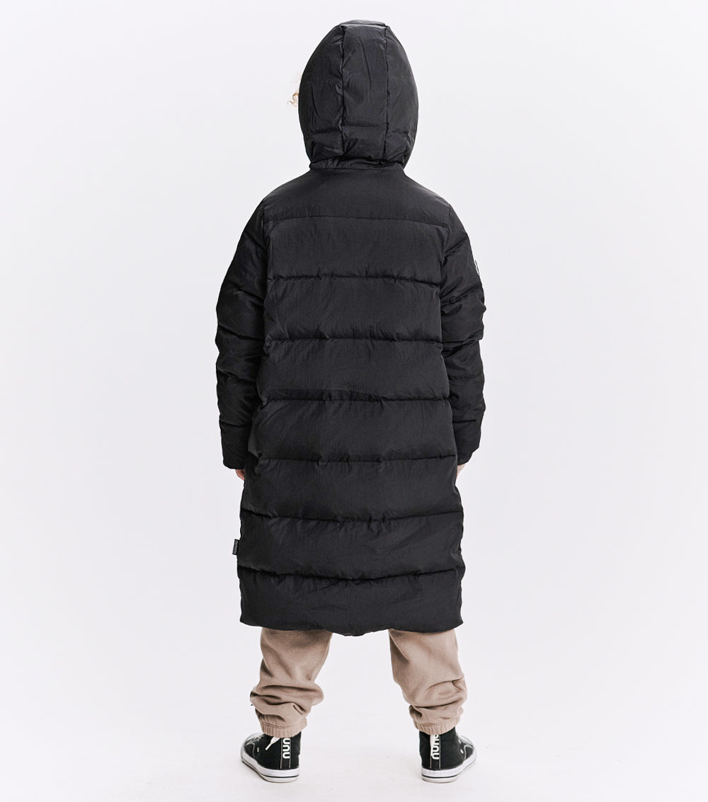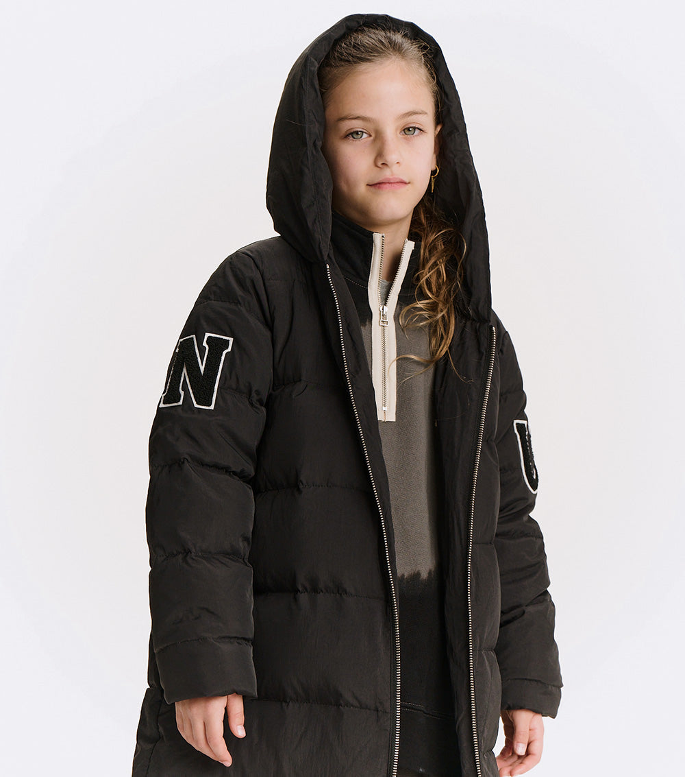 the ultimate nununu outerwear staple, this long black down coat will keep boys & girls rocking through winter in sleek style and a classic N patch on the sleeves. with an oversized hood & deep front pockets, it’s quilted for shape & equipped to keep your kid cozy. no worries about overheating though, we’ve got shoulder straps inside so kids can take it off and wear it like a backpack because they would never want to lose this killer piece.