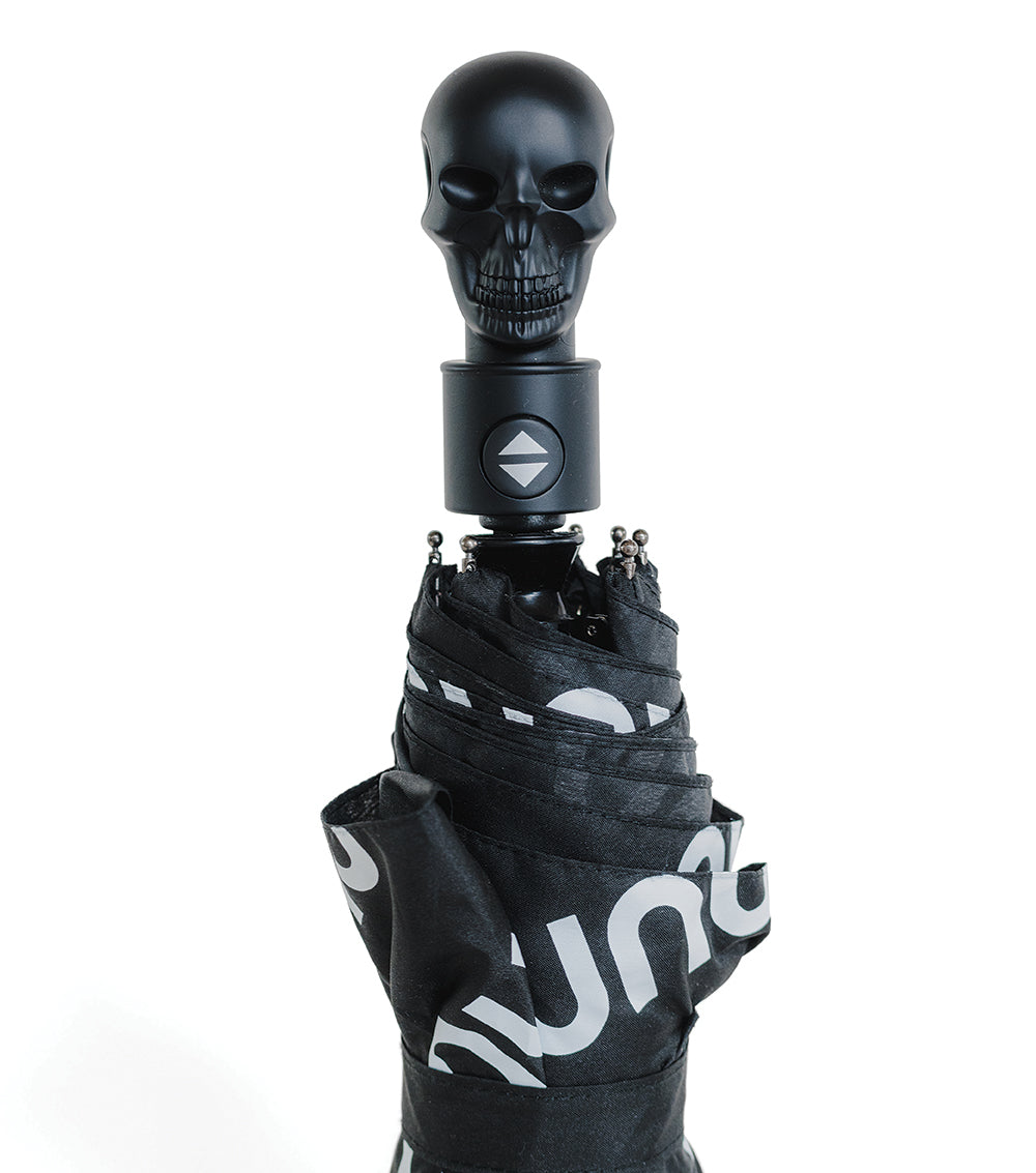 in our world, a rainy day is just a good excuse to bust out some dope accessories, like this kids’ black umbrella, dripping in our logo. super sturdy & high quality, it pops open automatically with the push of a button for those surprise downpours. the masterstroke here is the kooky black skull at the end of the handle.