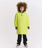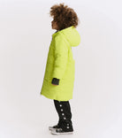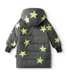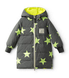 prepare to be totally starstruck by this dark grey and lime gender neutral down coat with our signature star print spangled all over it. it’s nice & long with cool striped quilting details and a big hood to hide from the paparazzi. it’s warm & puffy but still feels light. it's got side pockets to stash a beanie & mittens or a pen for signing autographs. oh yeah and did we forget the second design inside option? if your kid is feeling up to it the hot lime inside can be worn as a different coat completely, making your kid stand out from the crowd or even glow in the dark.