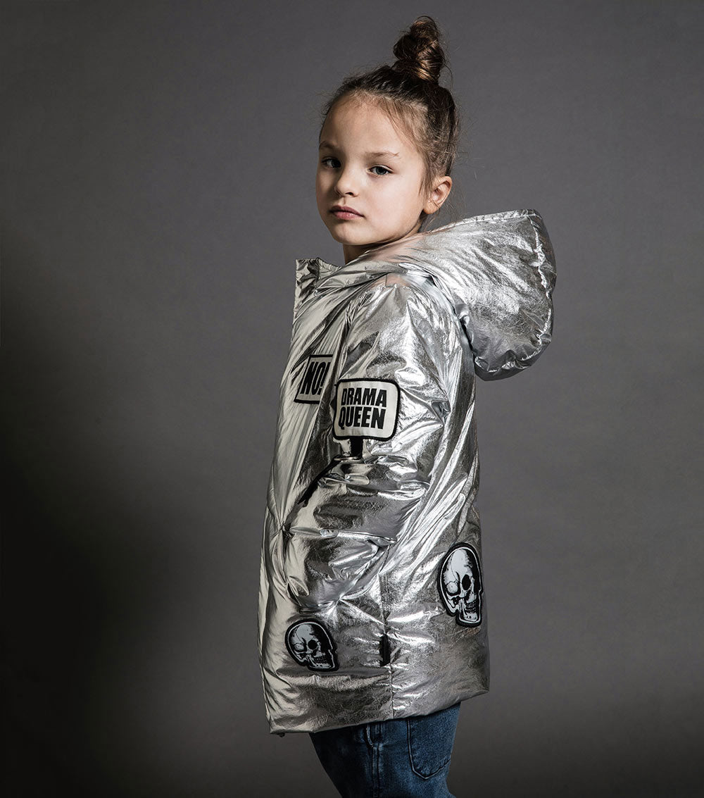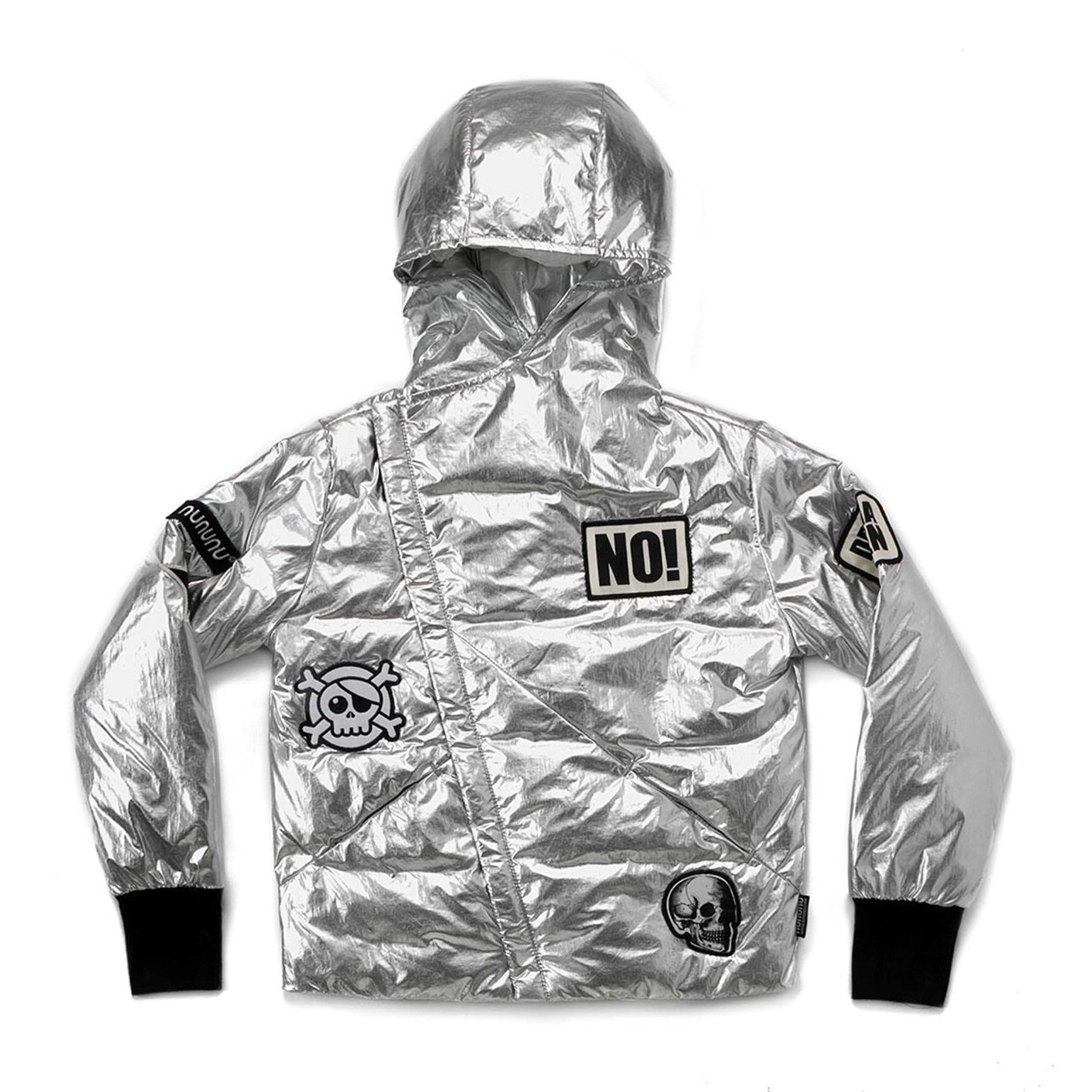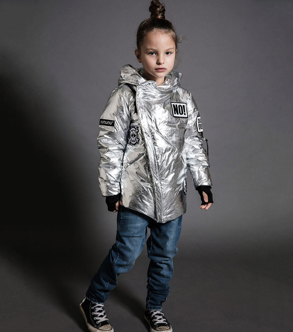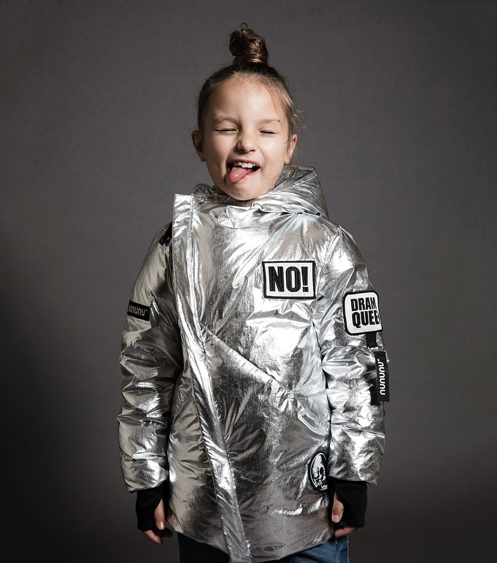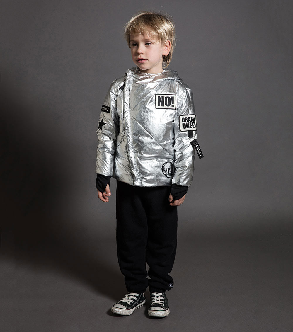 ground control to major tom. this incredible silver down jacket is inspired by a flight suit, but feels more like a sleeping bag. thumbholes, diagonal seams and an asymmetrical zip give it that nununu design flair, and a big cozy hood keeps it ultra-functional. as flashy as it is warm, it’s spangled with patches that show off nununu logos and favorite kid sayings (the word “no!” is somehow always a hit).