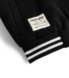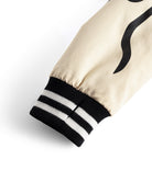 school spirit, just got a major upgrade with this letterman-style jacket. a classic look goes full rebel with a black felt vest & natural-colored faux leather sleeves printed with tattoo-style black flames. black & white details keep it bold with fuzzy patches of n & u on each side of the chest & striped ribbing at the collar, cuffs, and hem. a full set of snap buttons are there to wrap it all up. but the back is where the real story is at. our lightly-stitched graphic features a fearless feline breaking free with nothing but love & a really loud roar, kinda like your kid when rooting for their home team.