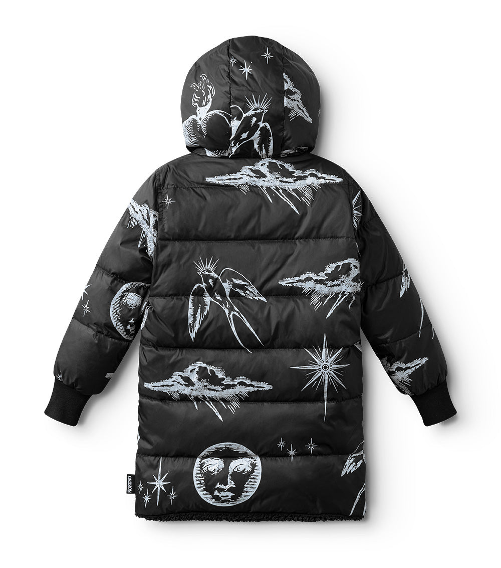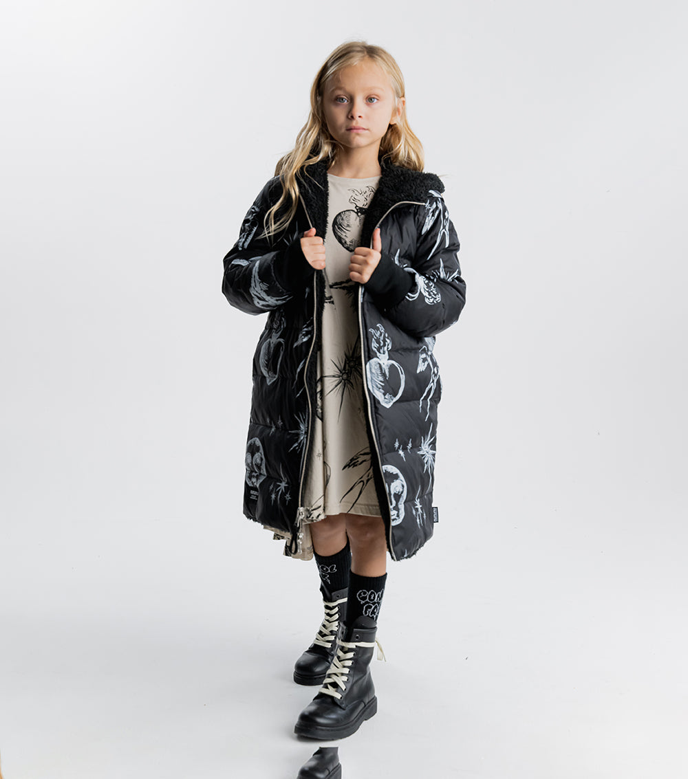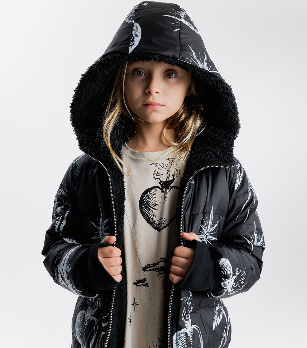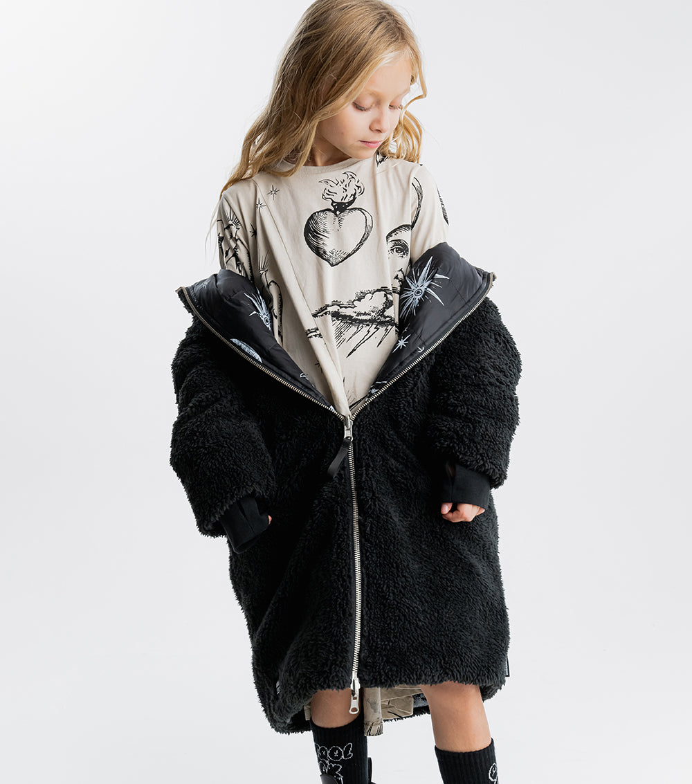 for those who are picky about texture, this black reversible sherpa & nylon down coat is the answer. the nylon side features the tat classics like flaming hearts, shining stars, and soaring songbirds. the other side is gobs of fuzzy black sherpa. perfect for your little black sheep. it’s got a longer length for extra warmth, side pockets, ribbed cuffs & our beloved thumbholes. the whole thing zips up the front to a giant hood you can hide under when things aren’t going your way.