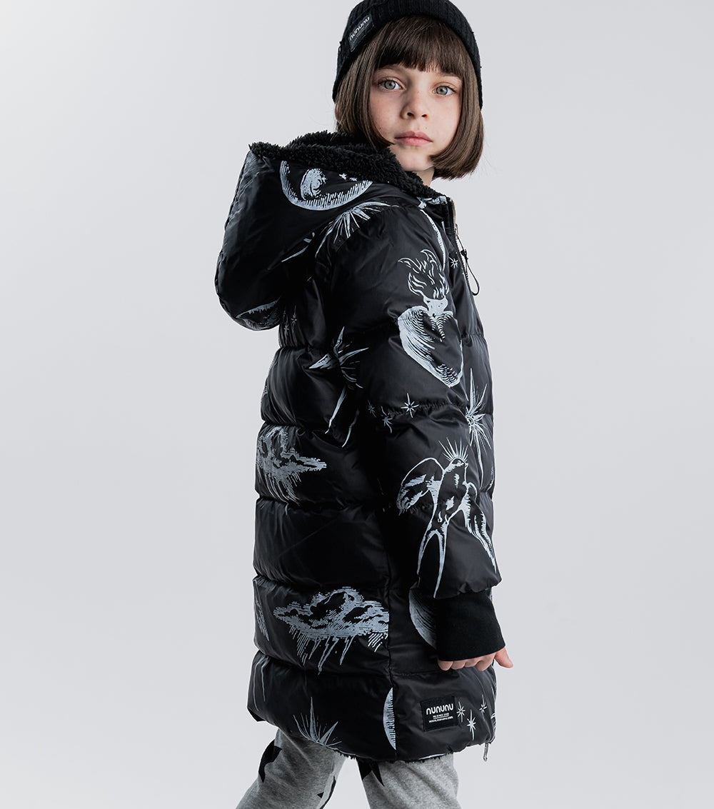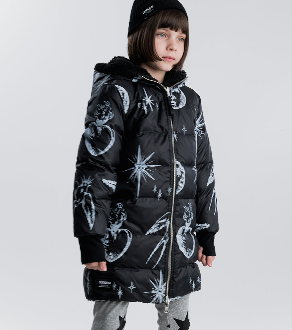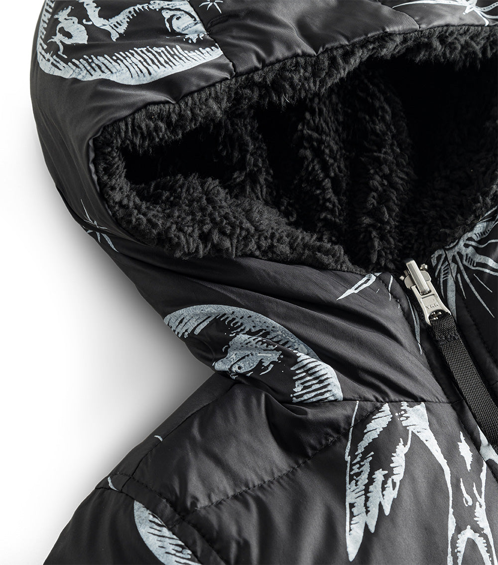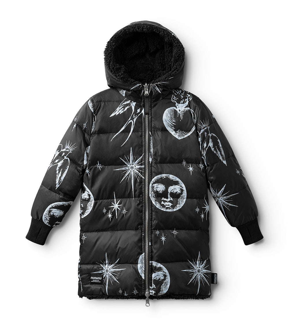 for those who are picky about texture, this black reversible sherpa & nylon down coat is the answer. the nylon side features the tat classics like flaming hearts, shining stars, and soaring songbirds. the other side is gobs of fuzzy black sherpa. perfect for your little black sheep. it’s got a longer length for extra warmth, side pockets, ribbed cuffs & our beloved thumbholes. the whole thing zips up the front to a giant hood you can hide under when things aren’t going your way.