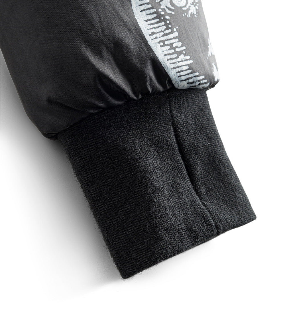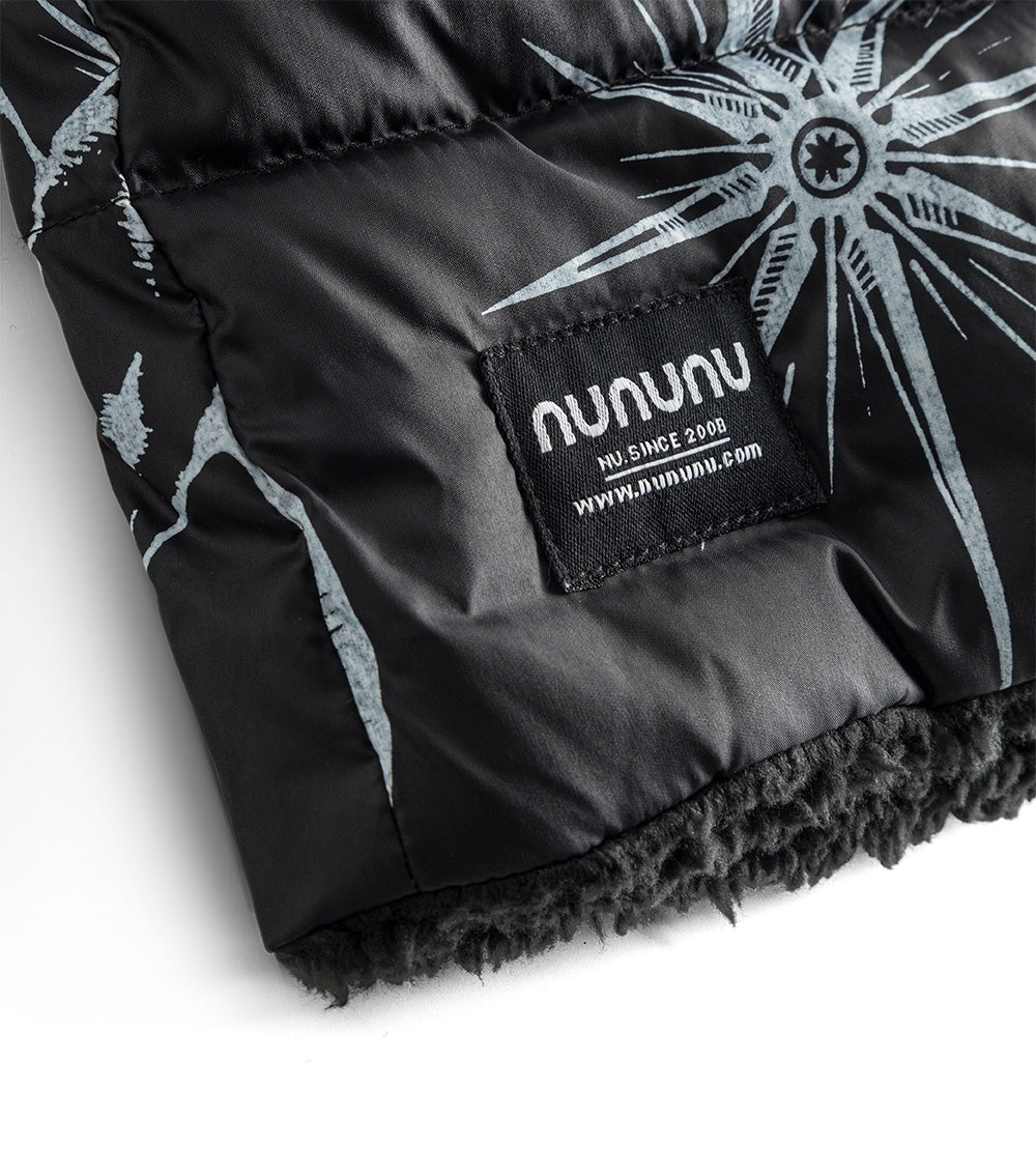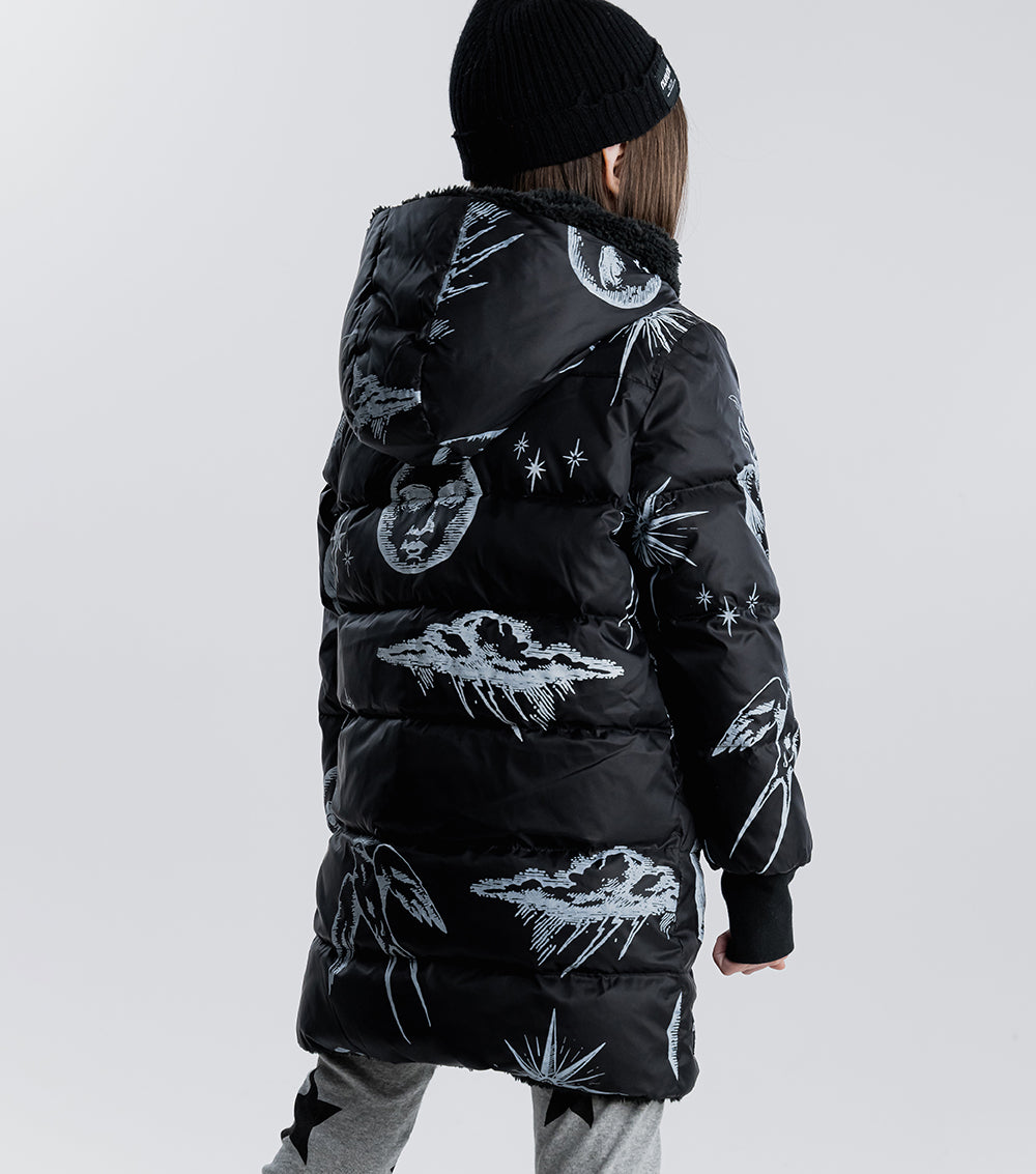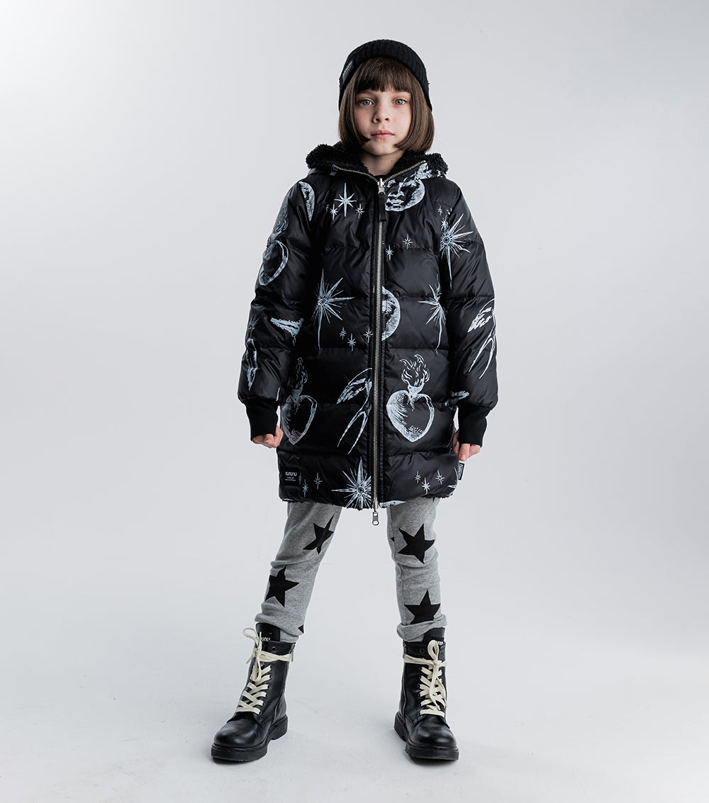 for those who are picky about texture, this black reversible sherpa & nylon down coat is the answer. the nylon side features the tat classics like flaming hearts, shining stars, and soaring songbirds. the other side is gobs of fuzzy black sherpa. perfect for your little black sheep. it’s got a longer length for extra warmth, side pockets, ribbed cuffs & our beloved thumbholes. the whole thing zips up the front to a giant hood you can hide under when things aren’t going your way.