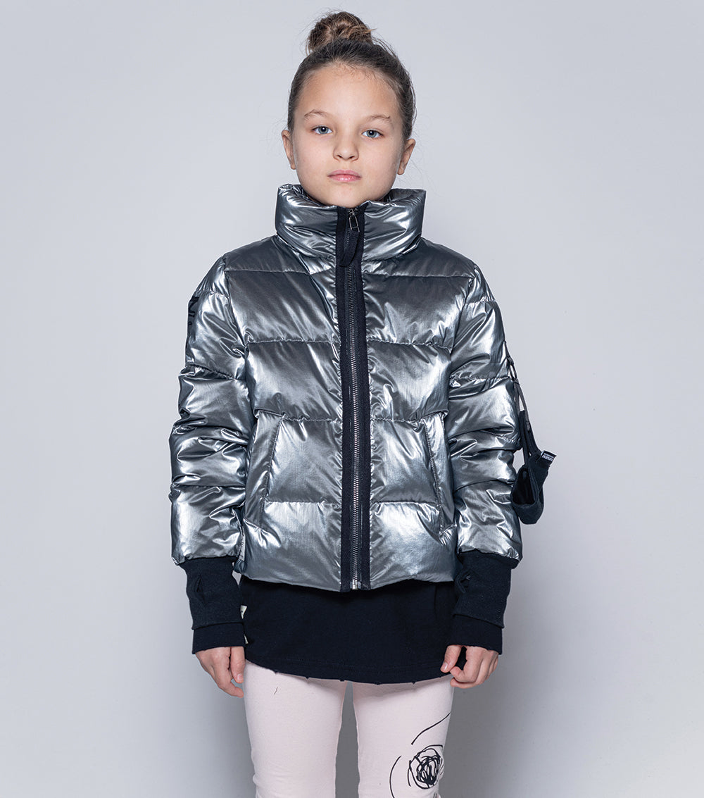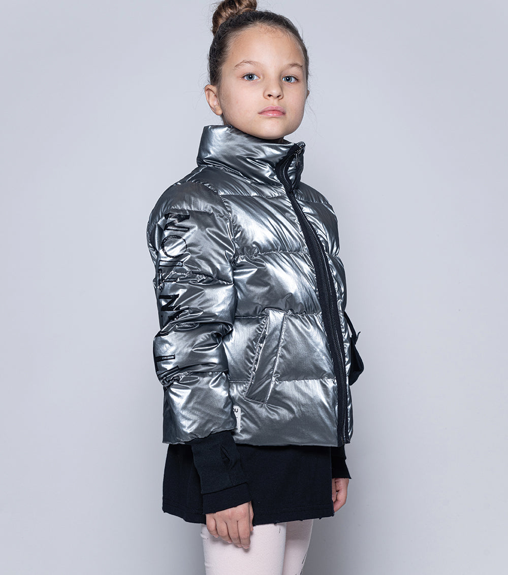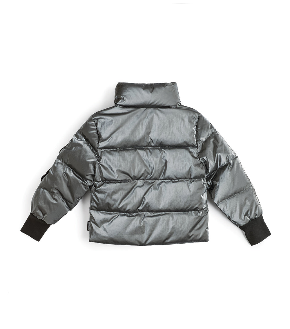be a complete showstopper in the fluffiest, flashiest down jacket imaginable. all-over super silver shine gives this baby a space-age fashion feel, with quilt stitching for shape & a chic short length. zips up to a high neck for extra warmth, while ribbed cuffs hold in the heat. on one sleeve the word “attention” is sketched out in block letters—the other sleeve features a logo snap-strap with a complimentary face mask attached. inside, we’ve got shoulder straps, so the kids can take it off & wear it like a backpack so they don’t lose this killer piece.