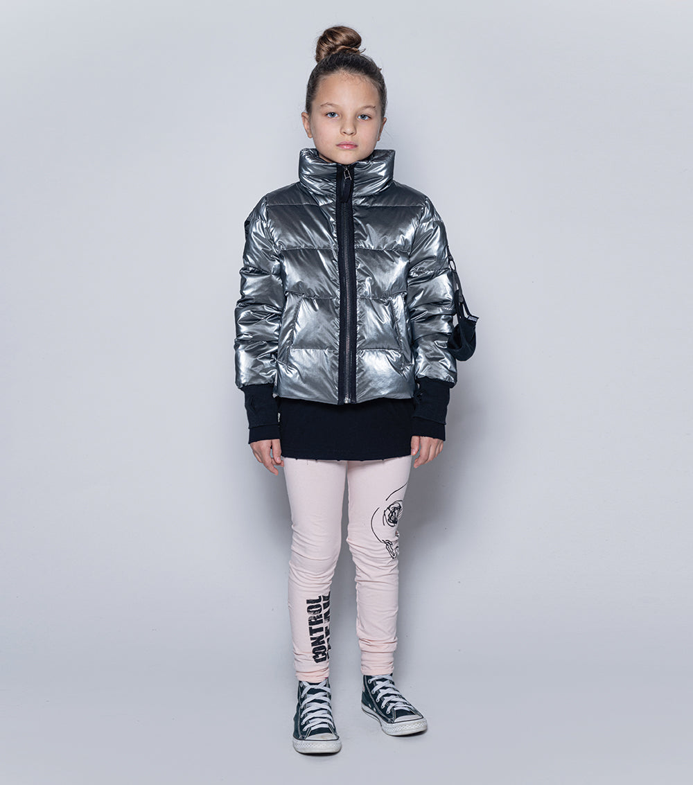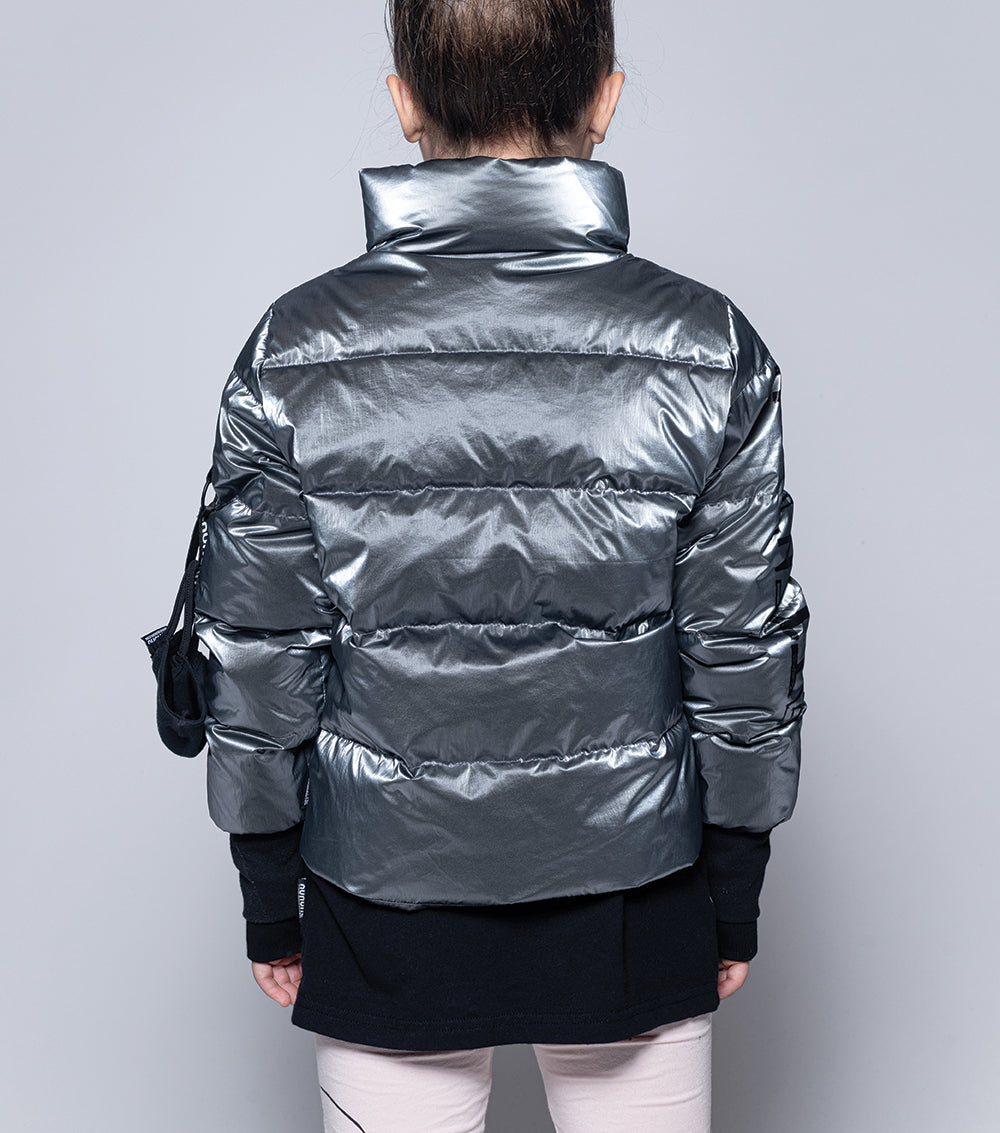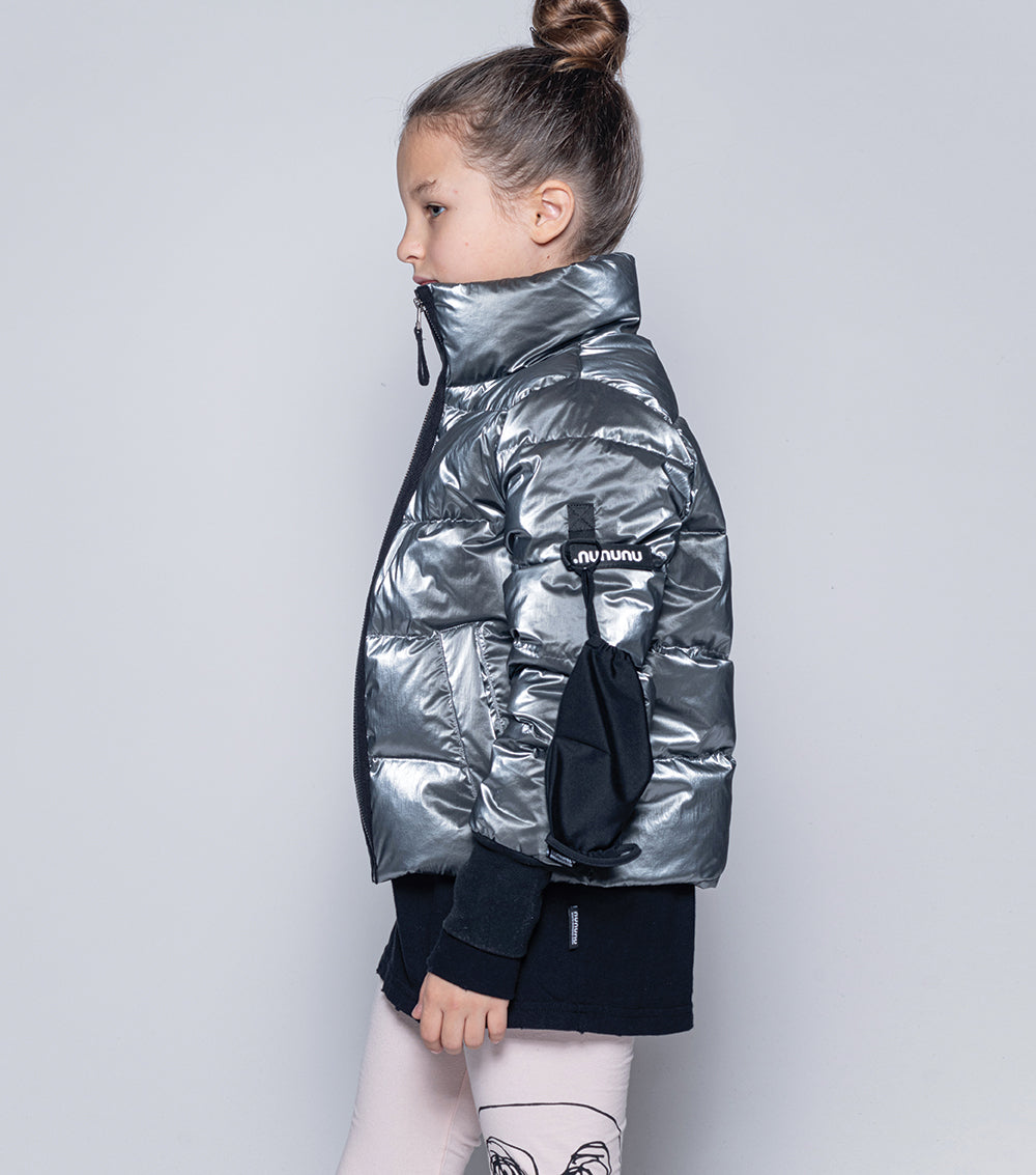 be a complete showstopper in the fluffiest, flashiest down jacket imaginable. all-over super silver shine gives this baby a space-age fashion feel, with quilt stitching for shape & a chic short length. zips up to a high neck for extra warmth, while ribbed cuffs hold in the heat. on one sleeve the word “attention” is sketched out in block letters—the other sleeve features a logo snap-strap with a complimentary face mask attached. inside, we’ve got shoulder straps, so the kids can take it off & wear it like a backpack so they don’t lose this killer piece.