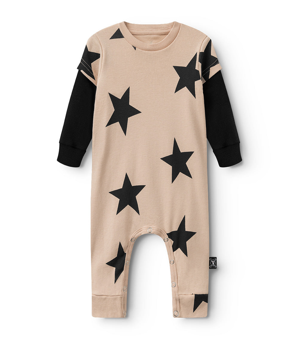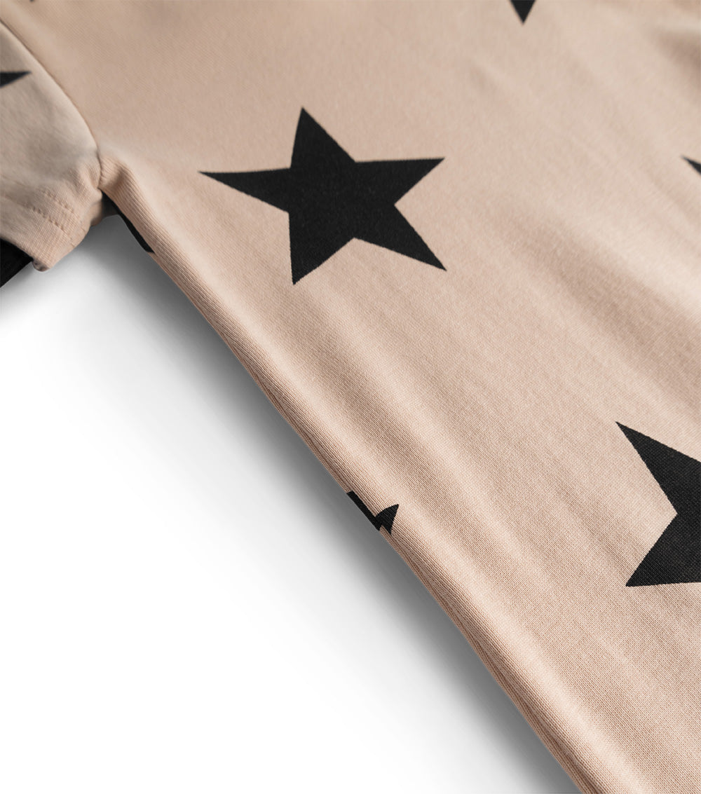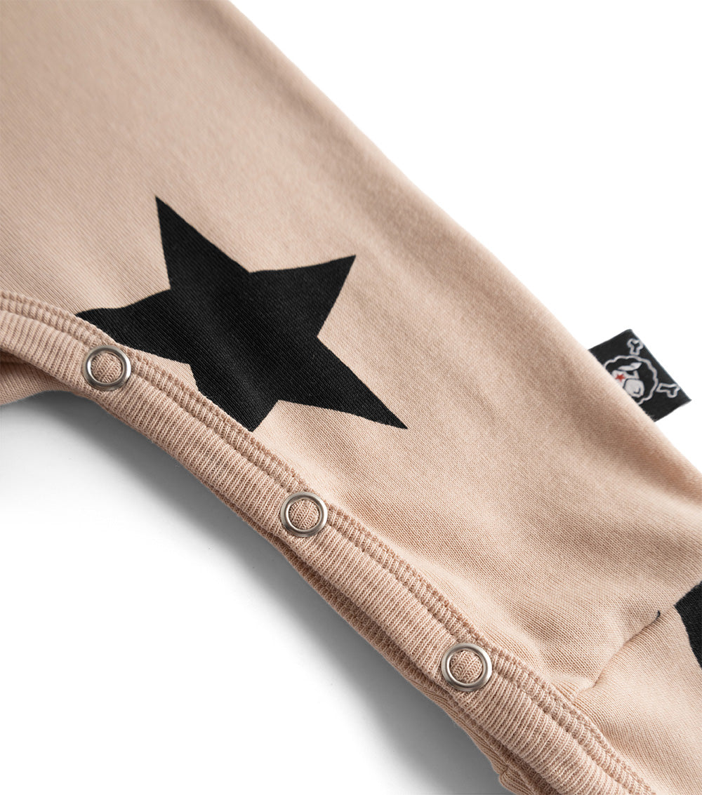 an easy piece to throw on them & forget about, this powder pink playsuit is crafted of our soft cotton. double layered sleeves give them that crust punk look without the smell, while our star print shows the world they mean business.