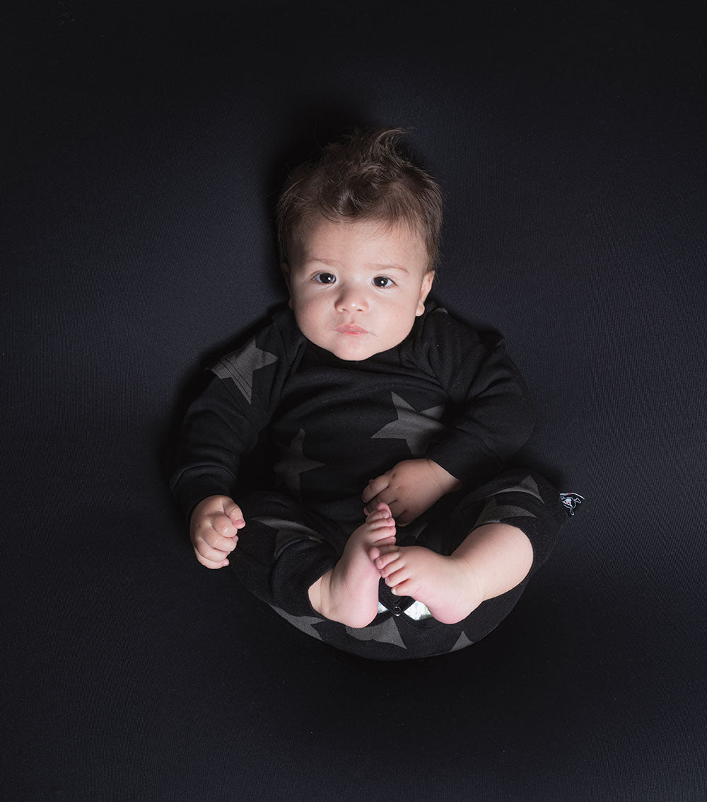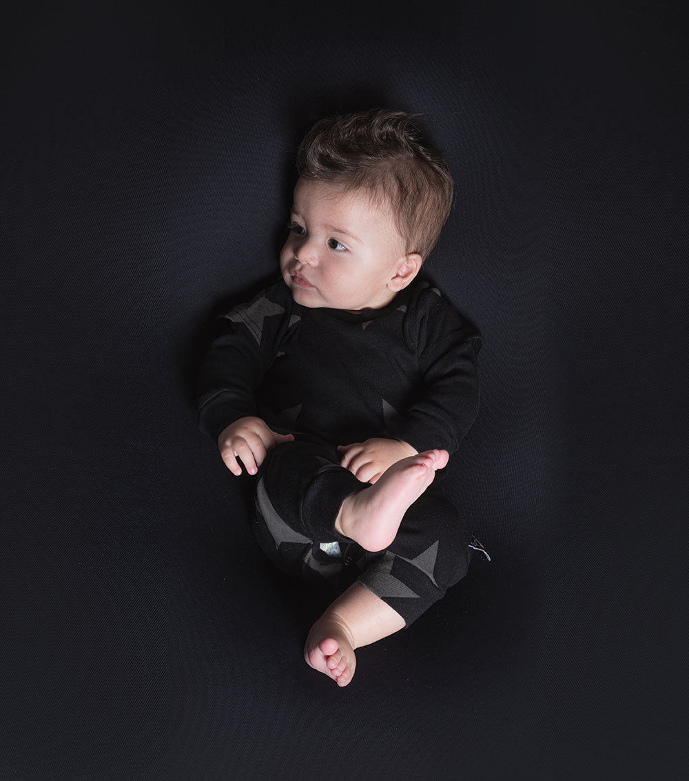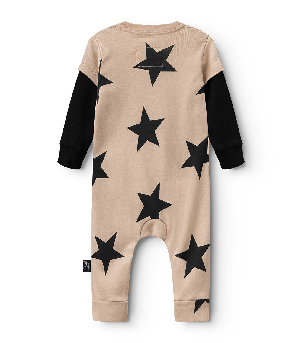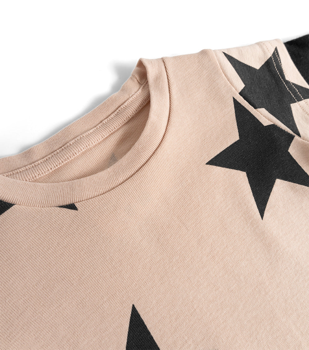 an easy piece to throw on them & forget about, this powder pink playsuit is crafted of our soft cotton. double layered sleeves give them that crust punk look without the smell, while our star print shows the world they mean business.
