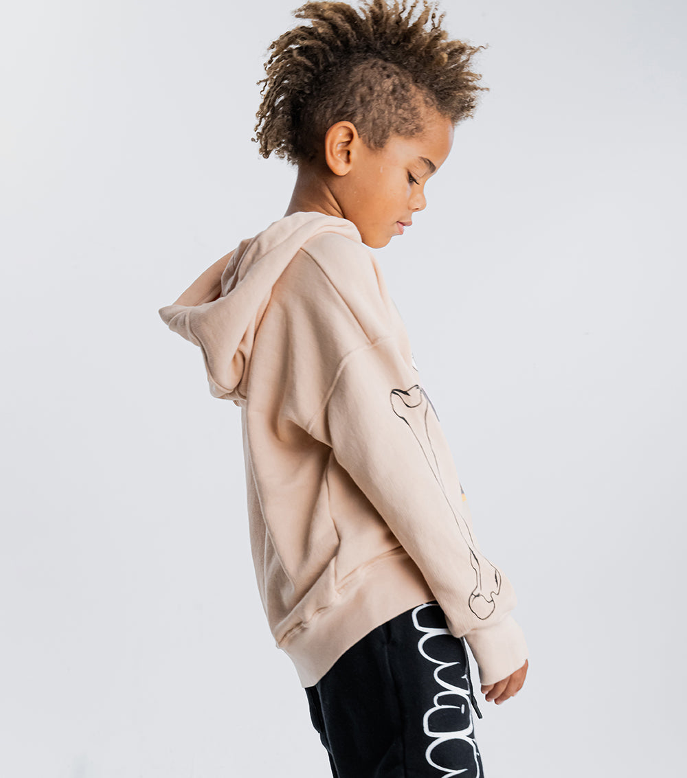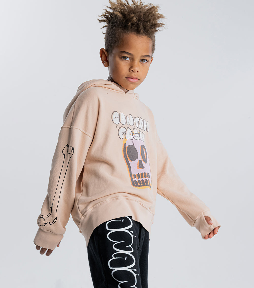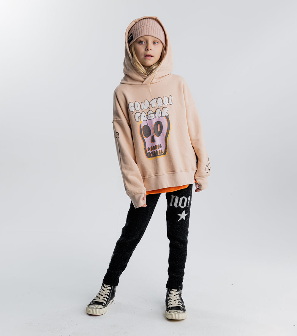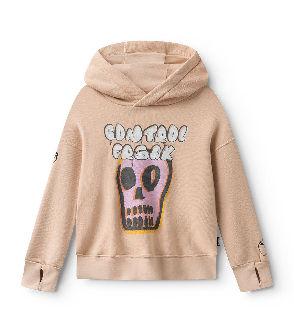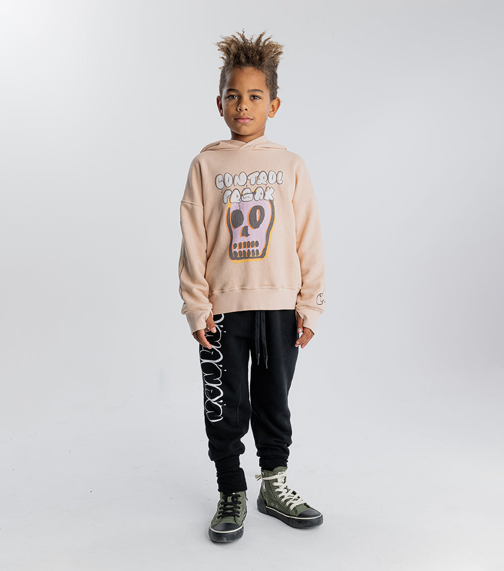 our crazy comfy hoodie is nude and dizzier than ever! a bold pink & orange skull shakes and quakes front and center, just under the words control freak in all their bubbly drippy glory. bones on each sleeve take the freaky up a notch. it's got an overlapping neckline hem, laid back thumb holes, and drop sleeve hem so it’s cozy as hell. this killer piece is part of collab with out-of-the-box artist shay id alony. so, of course, this unisex black hoodie has got creepy cool vibes for days.