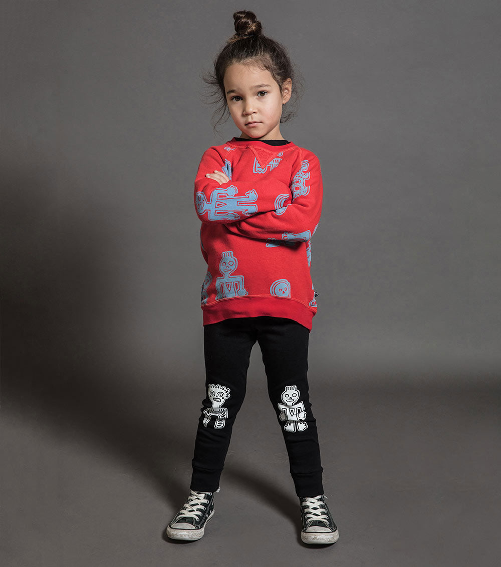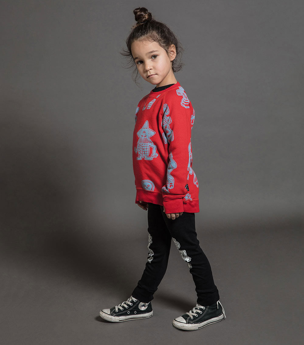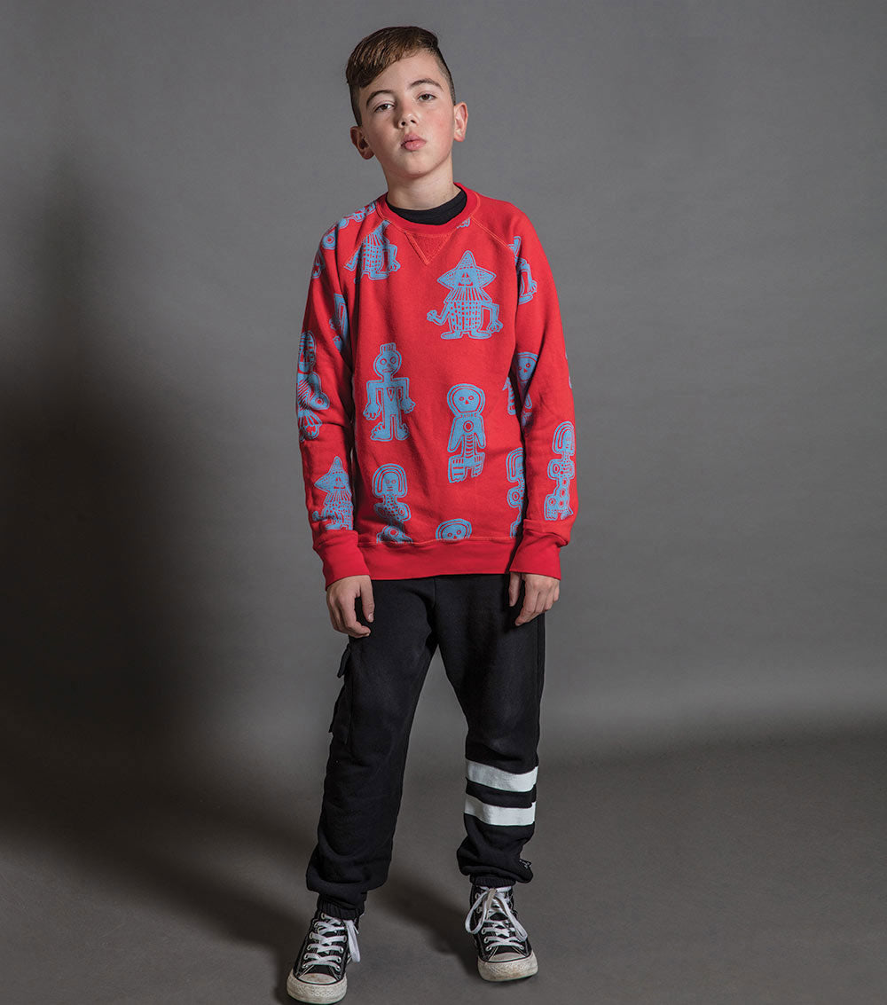 a quality red sweatshirt with lived-in comfort is essential nununu. this unisex piece comes splashed with our zany tribal dancers, a design collaboration with artist Shay Id Alony. the hi-lo hem makes it a perfect layering piece for boys or girls, as shirttails peek out from underneath.