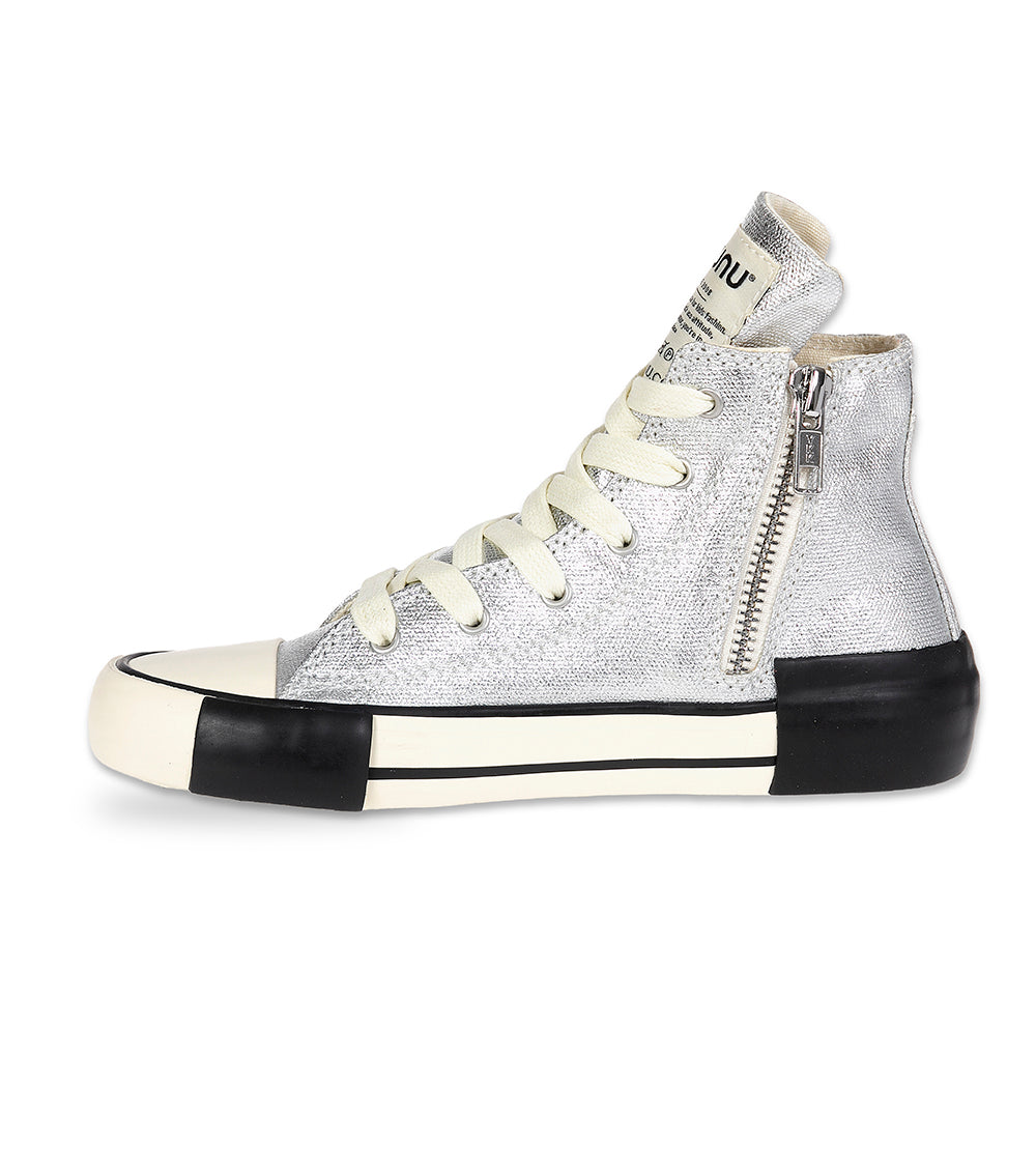 grab your shades because these shoes are shining bright on the boys & girls who wear them. the outside is made of a silver foil material that is designed to deconstruct, for a one of a kind pair of kicks. complete with a slightly angry embroidered black skull to offset the sweet with just a little bit of scary. to up the edge, the sole has got black strips that look like masking tape for a bolder, grungier look. the laces are totally functional, but we’ve installed these genius zippers at the inside ankles, so they can slip these on and off with ease.