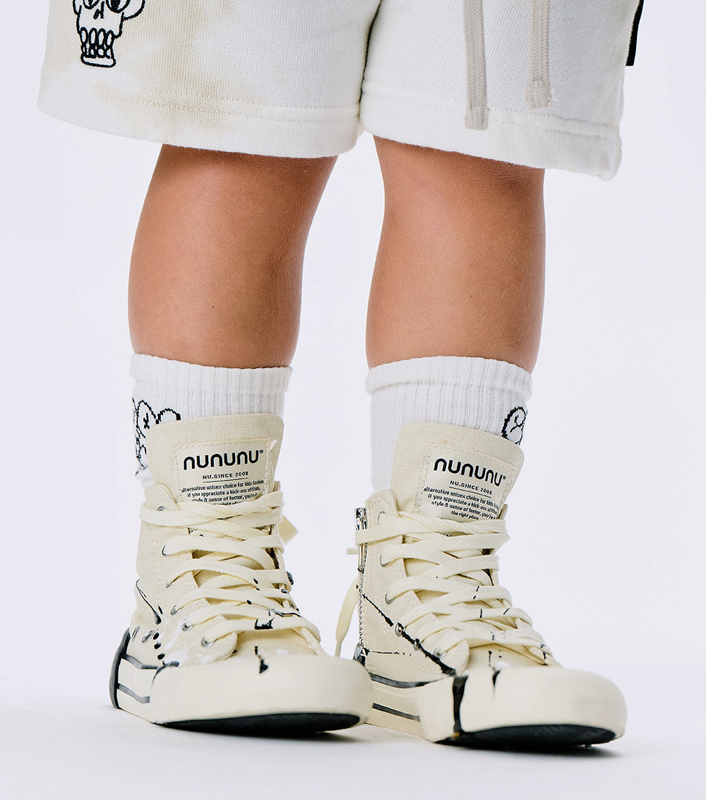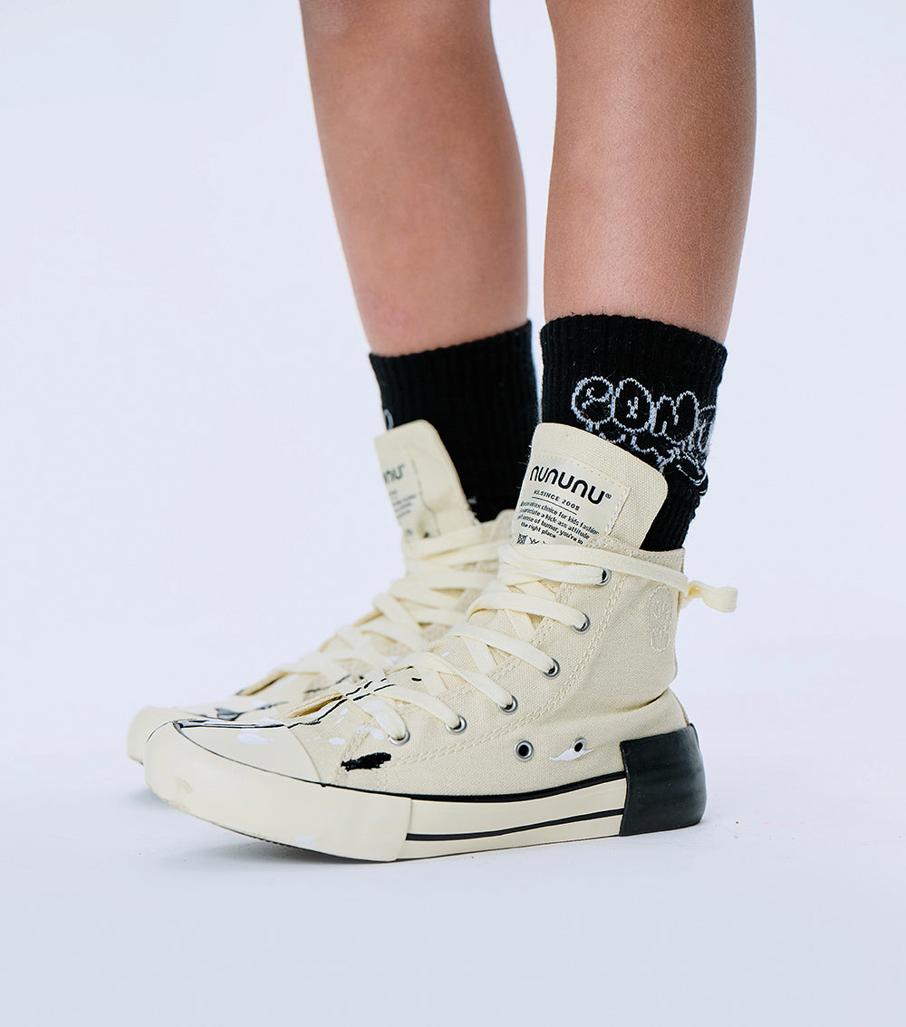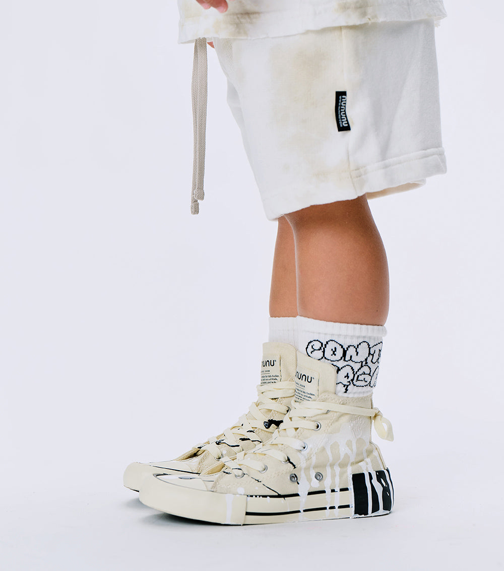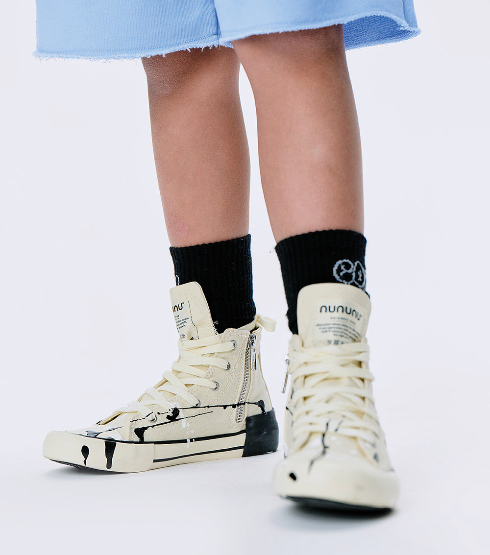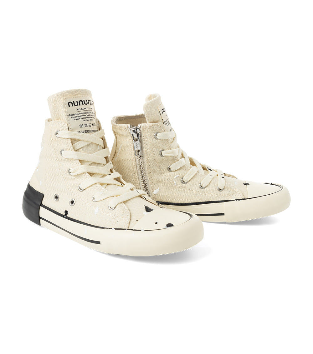 step into style with our exclusive natural canvas high tops, now with a unique twist. each pair features handcrafted white and black color splashes*, making every shoe a one-of-a-kind masterpiece. the breathable canvas and side zipper ensure comfort while the edgy design hand splattered by our designers guarantees you'll stand out from the crowd. perfect for those who dare to be different, these high tops combine artistry and fashion effortlessly. don’t miss your chance to own a piece of wearable art!