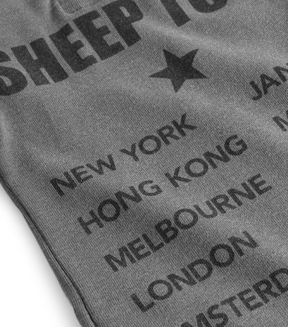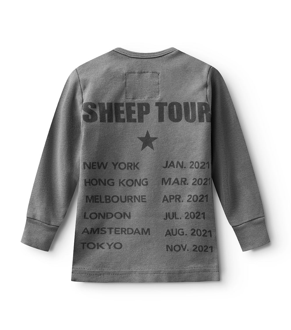 too early to start labeling the kid as the black sheep? we think not. which is why we have our beloved black sheep logo in a sprayed effect on this vintage grey unisex concert tour-style t-shirt for cool babies. according to this long sleeve, beefy cotton shirt, baby has been jetsetting all over the planet for epic gigs throughout 2021. the neck is flexible to make it easy to take off when they want to go shirtless.